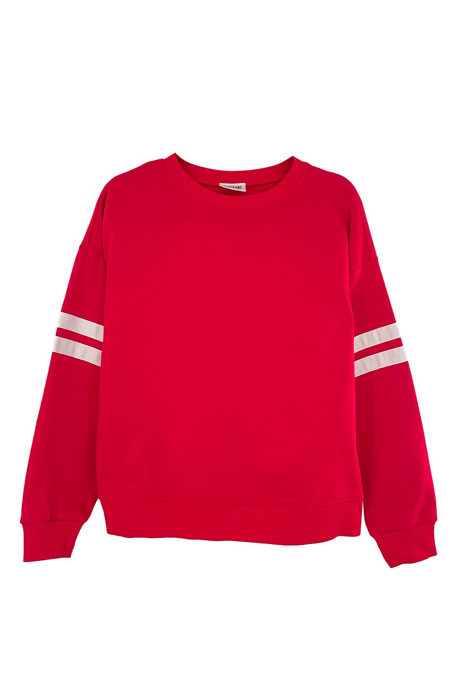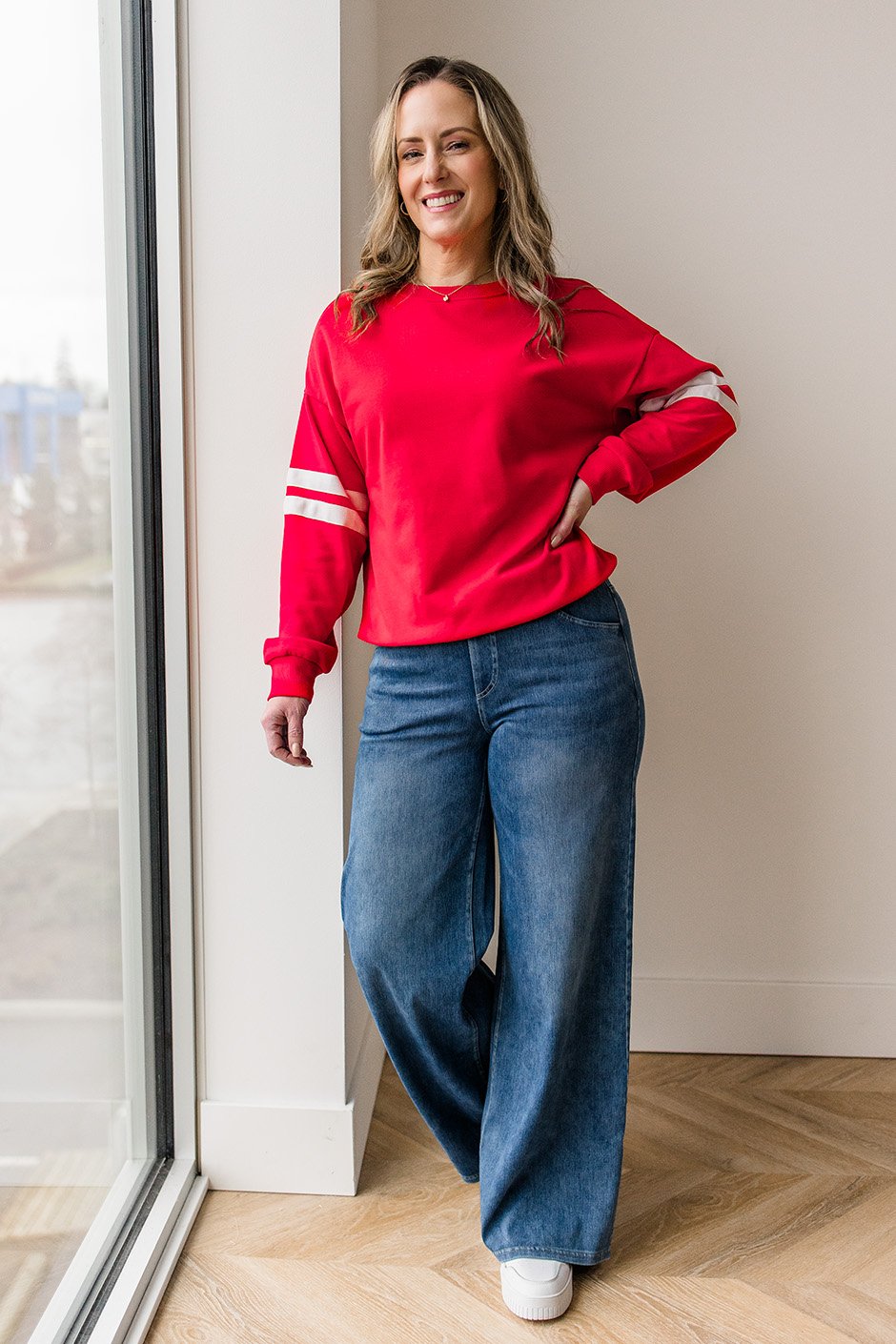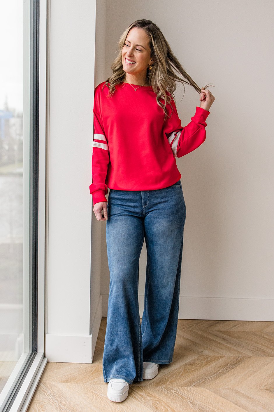 Hello, red moment! ❤️ This sweatshirt definitely caught my attention and I loved how it looked on. It has that classic round neck, dropped shoulders, and ribbed hem & cuffs, with a varsity-style stripes around the sleeves (which I love). The fit is true to size (I’m wearing my usual size small), it's in that perfect in-between zone: relaxed and comfy without being oversized or tight. Gotta love Salti!