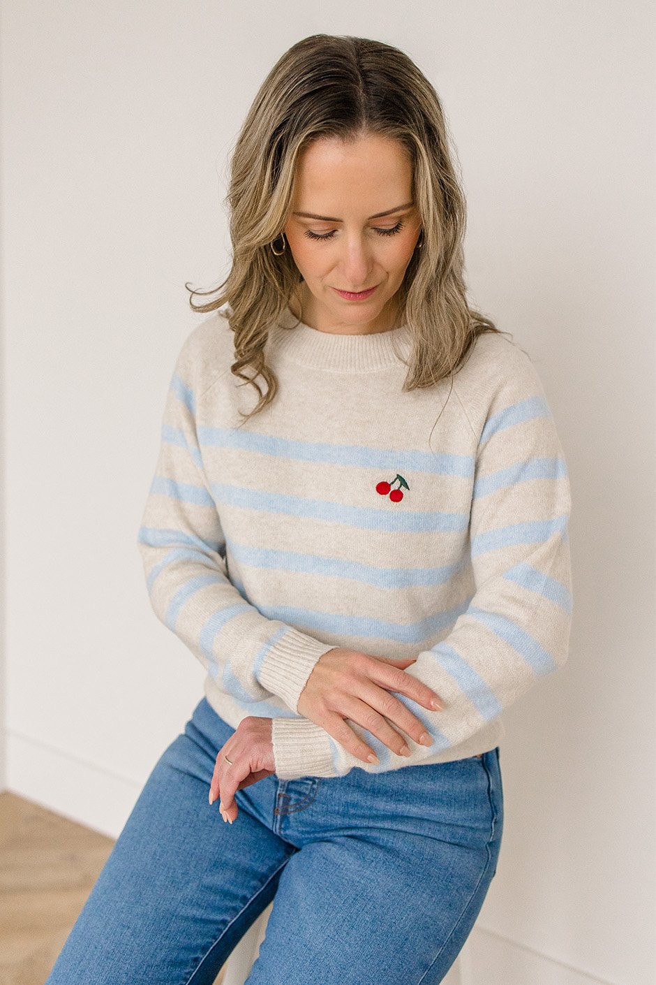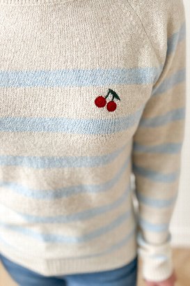 This striped sweater features a cute embroidered detail on the front and a soft, stretchy feel for all-day comfort. Easy to wear and ready to brighten any outfit..