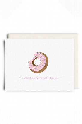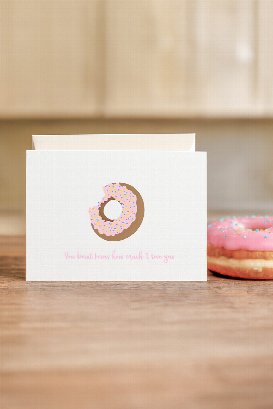 “You donut know how much I love you.” A little pun, a little heart, and a lot of love; this card is a fun way to share your feelings. Made in Canada on acid-free recycled paper by Canadian artists.