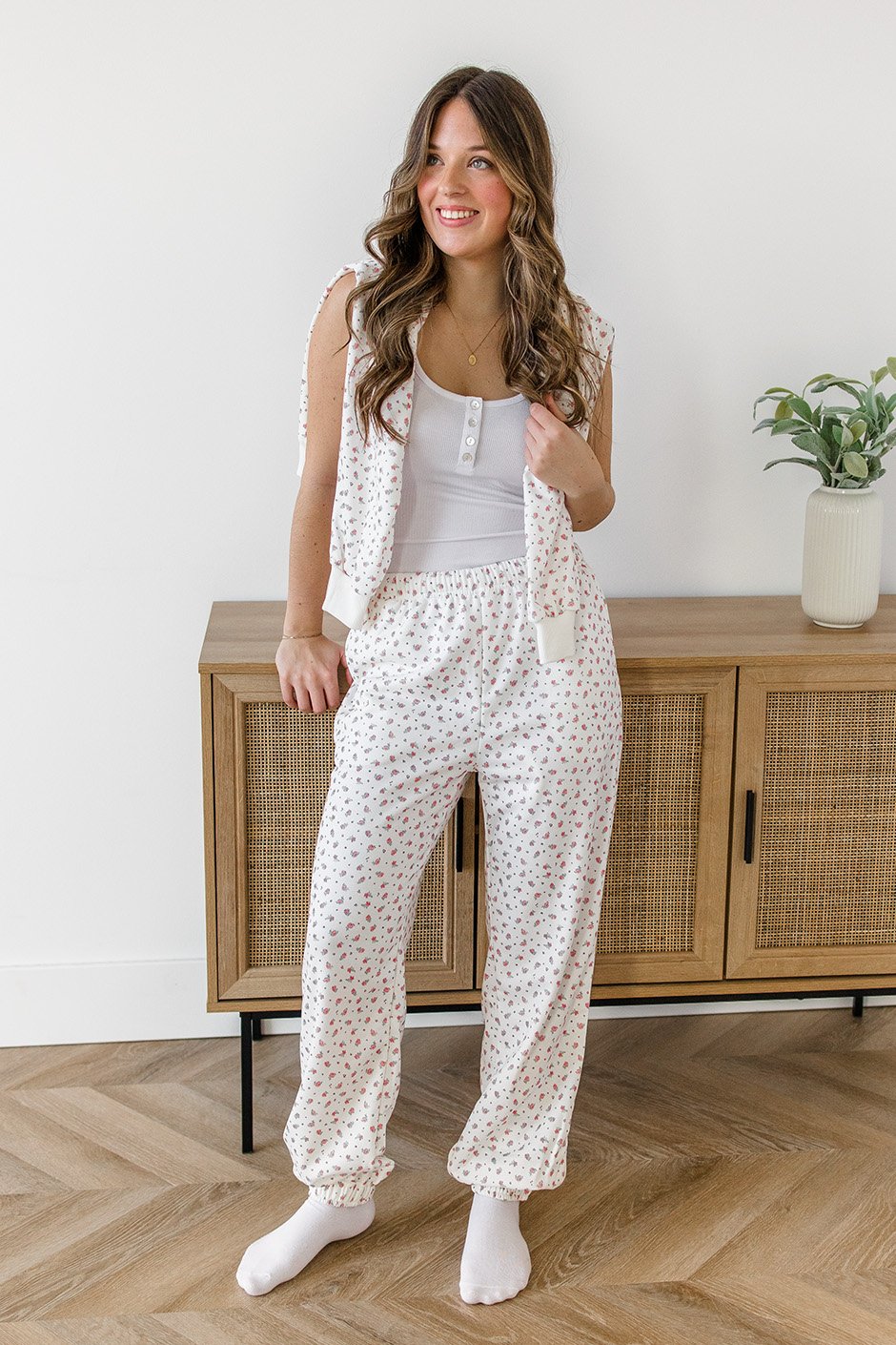 The Meadow Days Set brings soft spring vibes with delicate florals and a cozy fleece interior. Perfect for those in-between days when winter's ending and you're already dreaming of warmer weather. Wear the set together or style the pieces on their own.