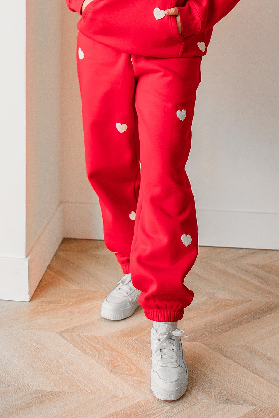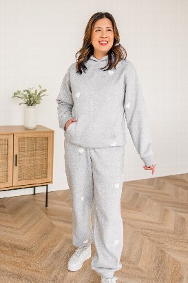 Who knew you can look so chic in sweatpants?! These joggers have the perfect fit to them. It has a nice elastic hem cuff and the leg is roomy and drapes beautifully. The puff hearts are all random, so each piece will be unique. The fabric is a medium-weight sweatshirt material with a super soft interior. There are roomy side pockets. I normally wear S/M in Brunette The Label; however, I am wearing size XS/S in Red & White and S/M in the Pebble Grey & White. Since the sizing is split sizing, I actually feel comfortable in both sizes. If you prefer a little less baggy, size down and if you prefer more room, size up.