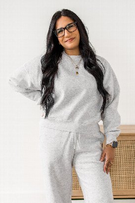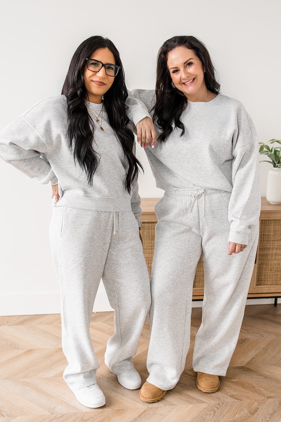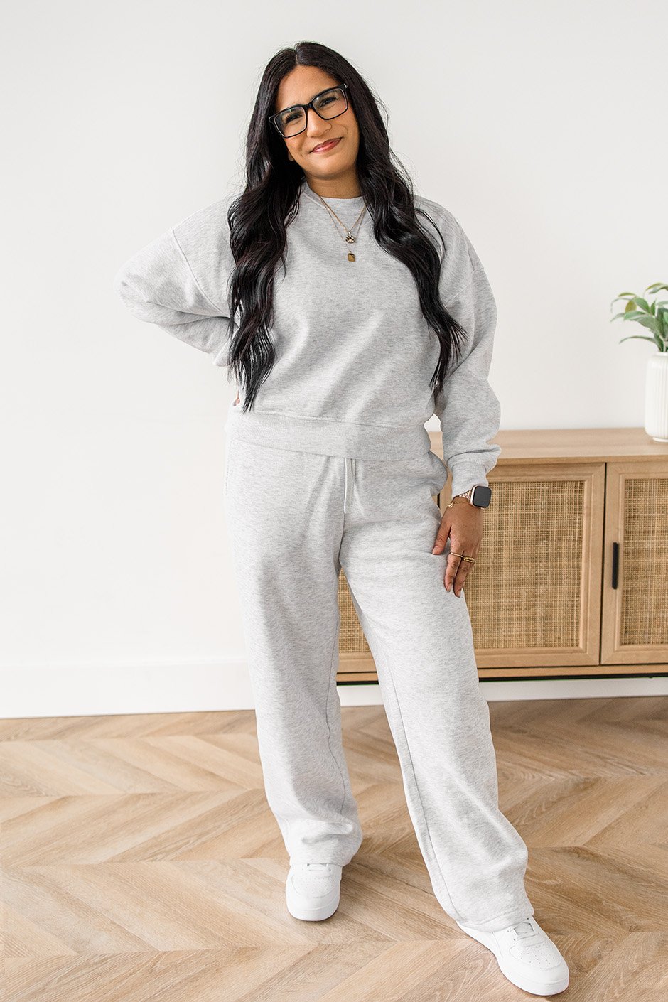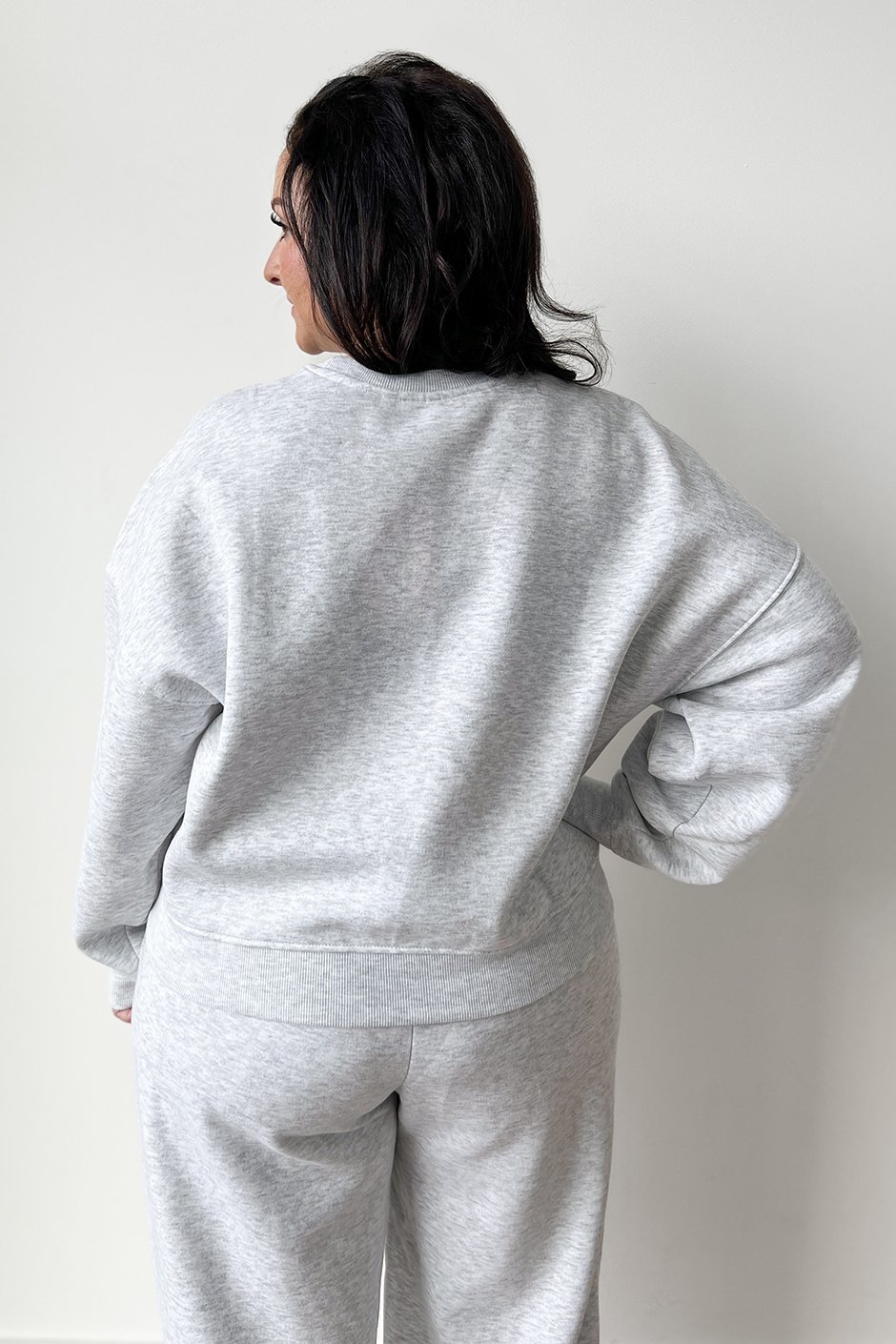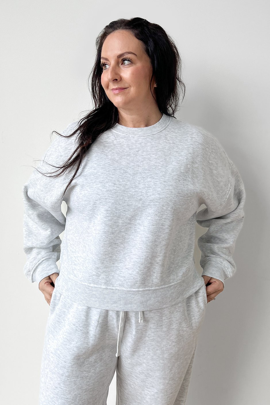 I loved this sweatshirt so much. It’s insanely cozy with a relaxed fit and the softest fleece on the inside... like actual baby blanket soft! I wore a medium, and it fit perfectly. It’s super cute worn with the matching sweatpants for an easy put-together look (just add accessories), but I’d also wear this with jeans, joggers, or as my at-home PJ top.