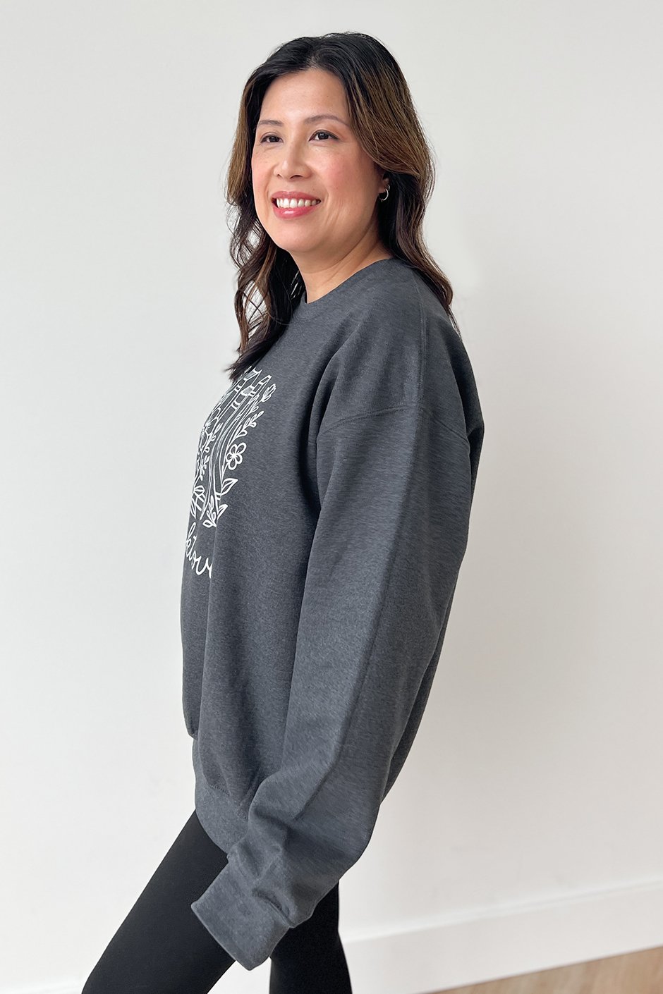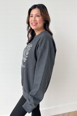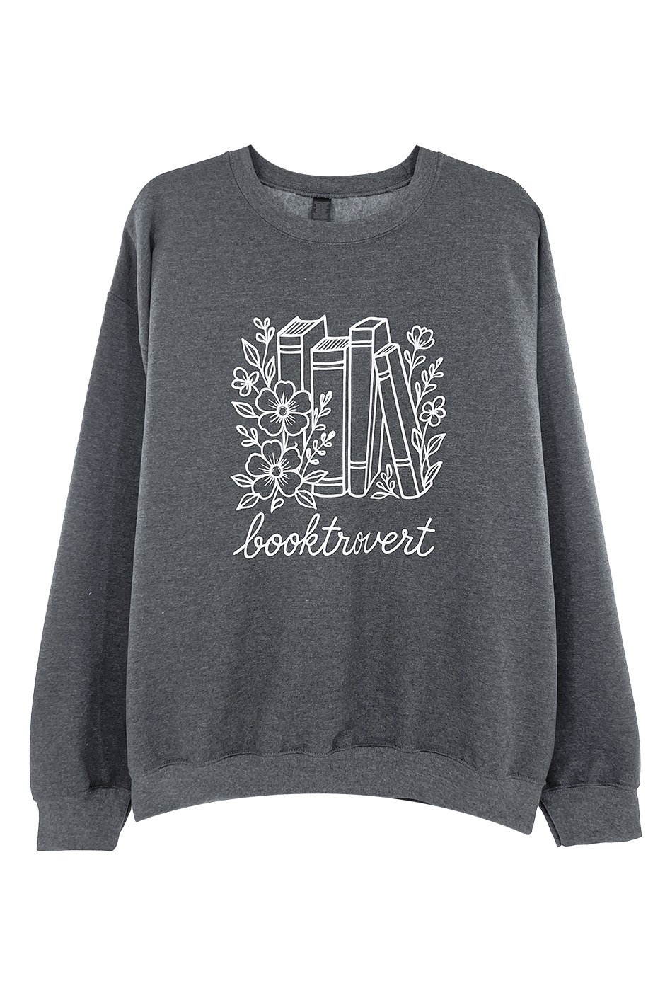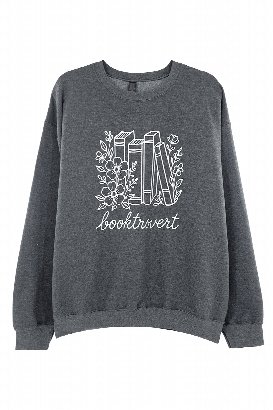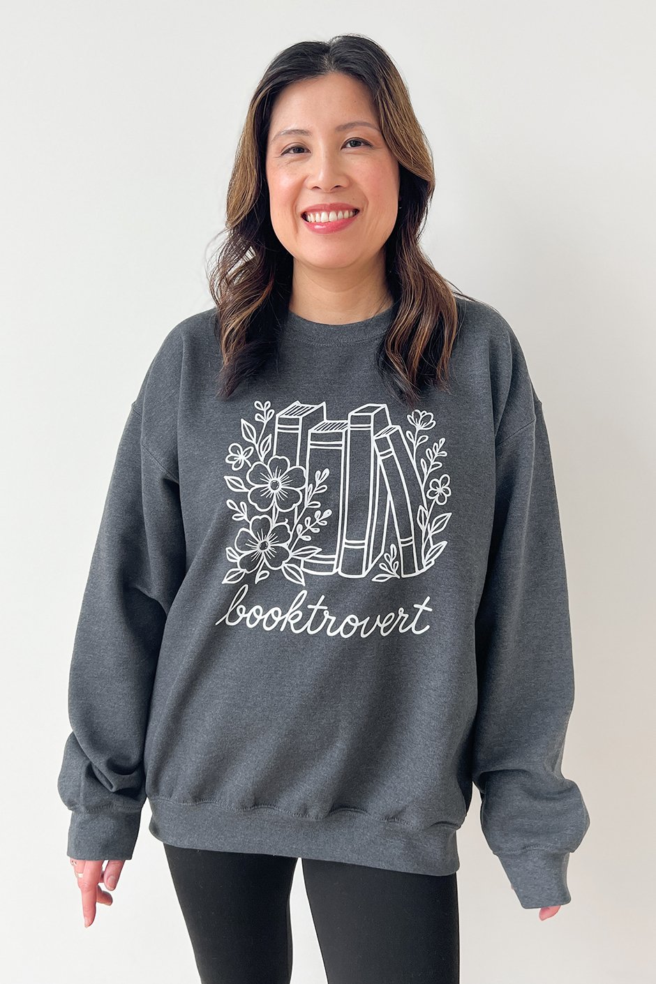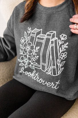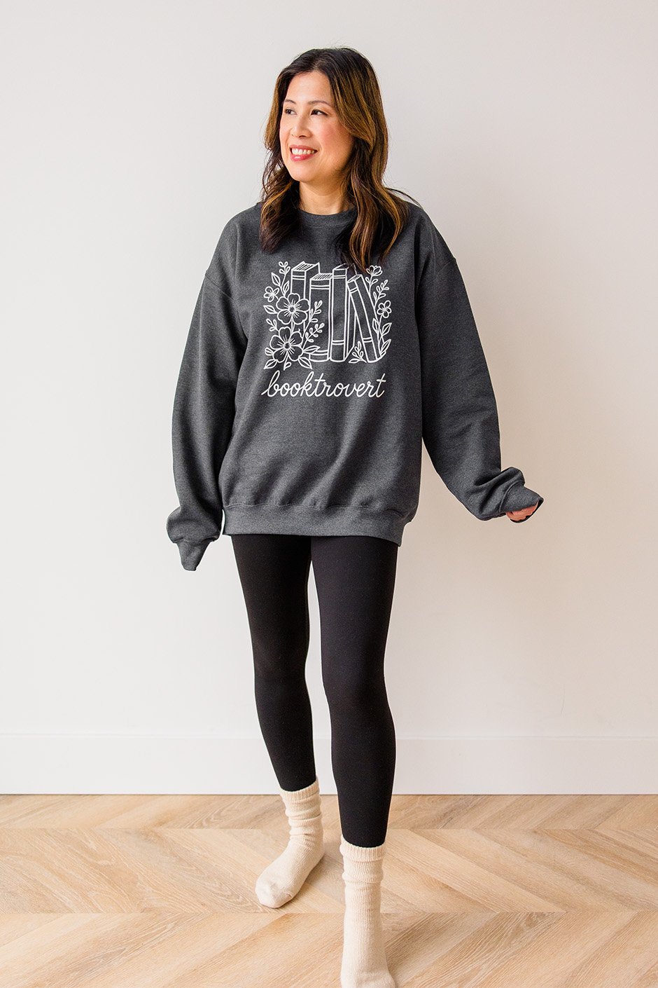 OMG! This is so cozy! This is the perfect sweatshirt to cuddle up and read a book. Whether you read traditional books, e-books, or audiobooks, I think you can call yourself a Booktrovert! This is a medium weight fabric with a fleecy interior. The photoshoot sample is a size Large and I am normally size Small. I normally would wear a size Small but after trying size Large, I feel like I could size up to Large or even Medium for that cozy vibe.