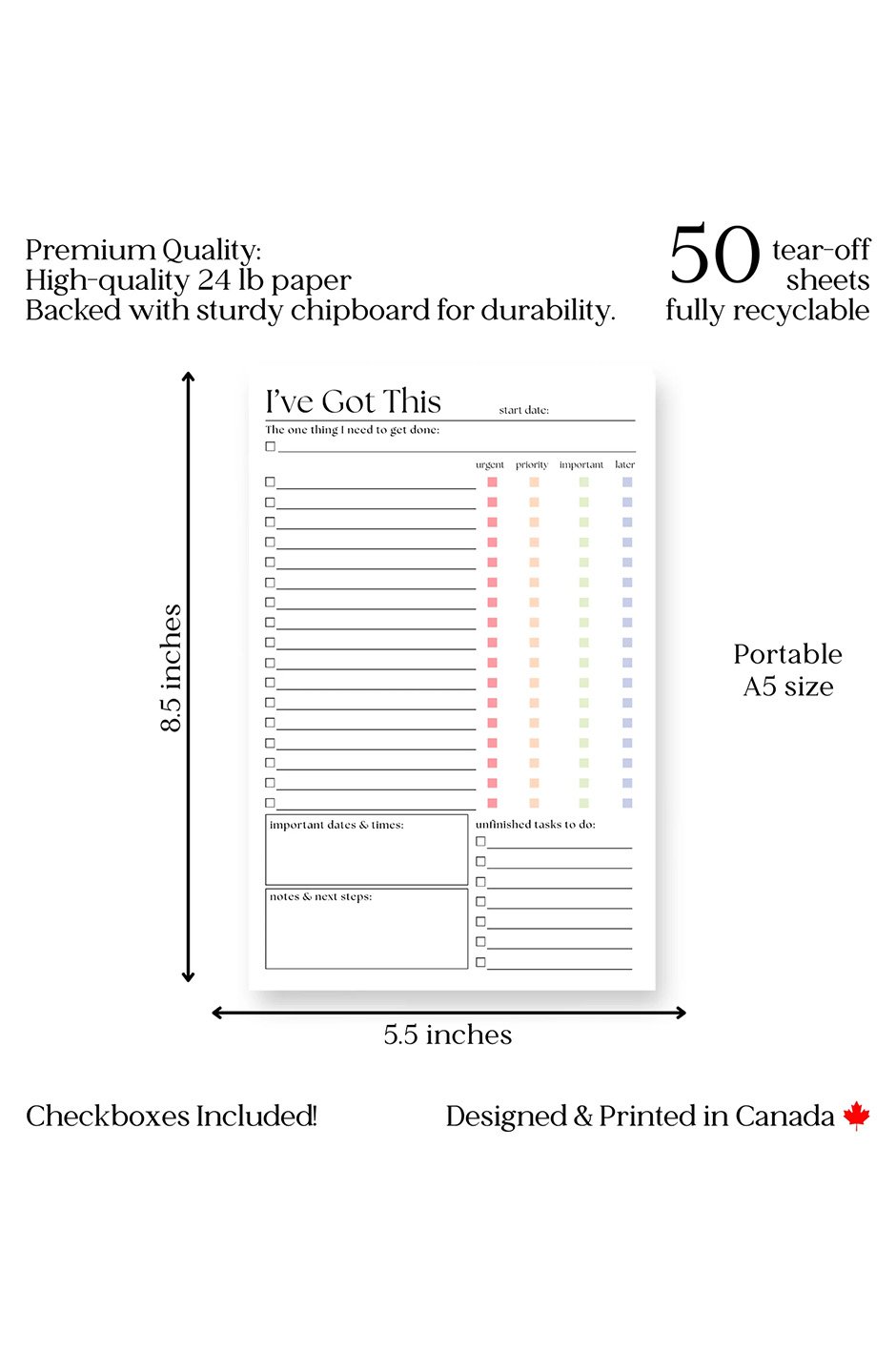 I've Got This Notepad will become your memory prompt, organizer aid, and visual motivator. Not just for people with big goals, a to-do list can help clear your mind, track your progress, and focus your efforts.