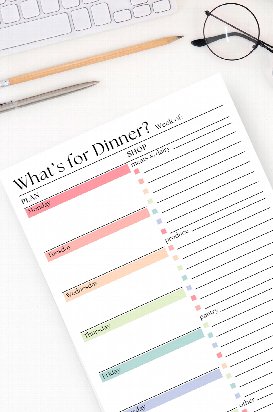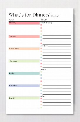 The What's for Dinner Notepad will become your memory prompt, organizer aid, and visual motivator. A meal planner can help clear your mind, track your progress, and focus your efforts. In just a few minutes, you can clear your mind of all those thoughts cluttering your mind.