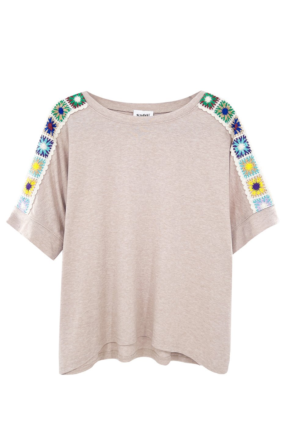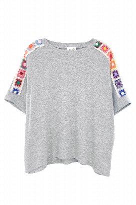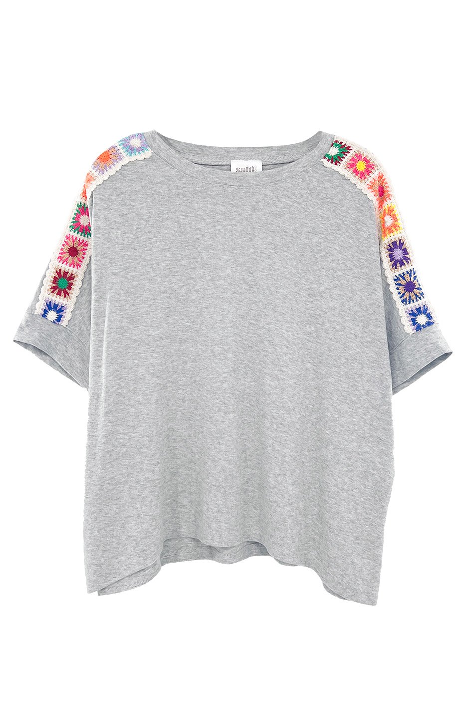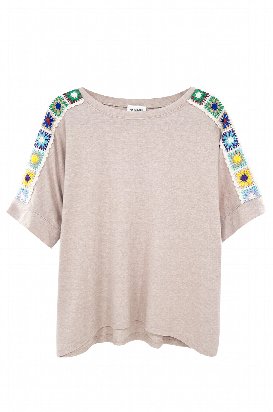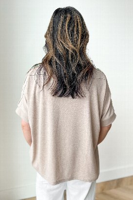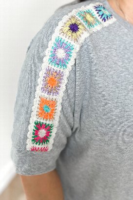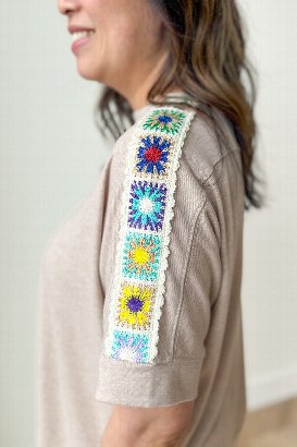 This top is so nice and easy to wear! It is a relaxed fit, medium weight top. It has good stretch and a finished cuff. The crochet shoulder trim makes this top extra special. This top is easy to tuck or leave untucked. I am usually wear size Small and this is the size I am wearing here. It is a great fit for me and there is still room.