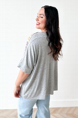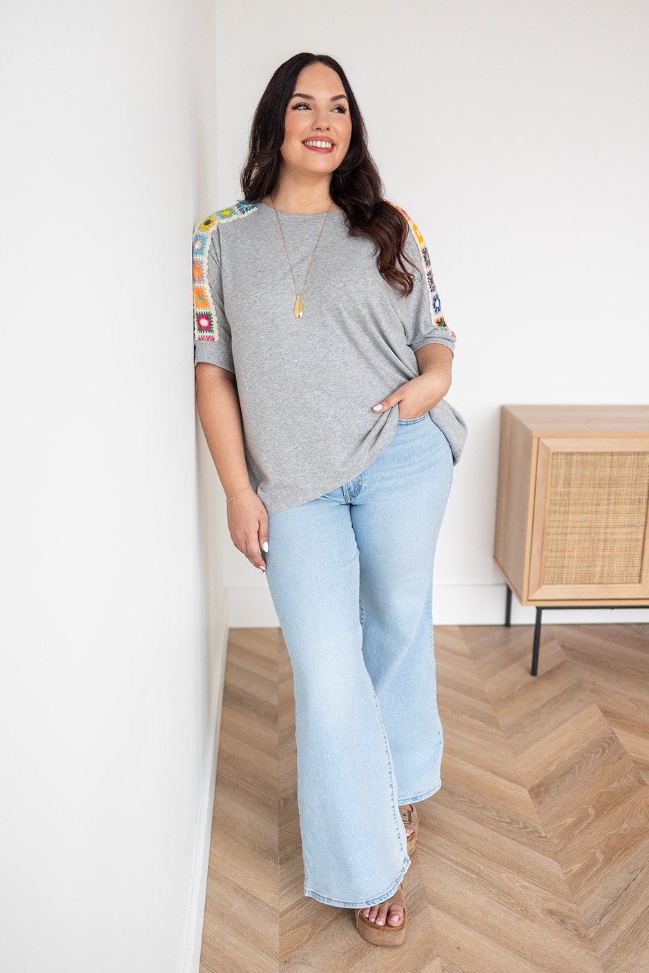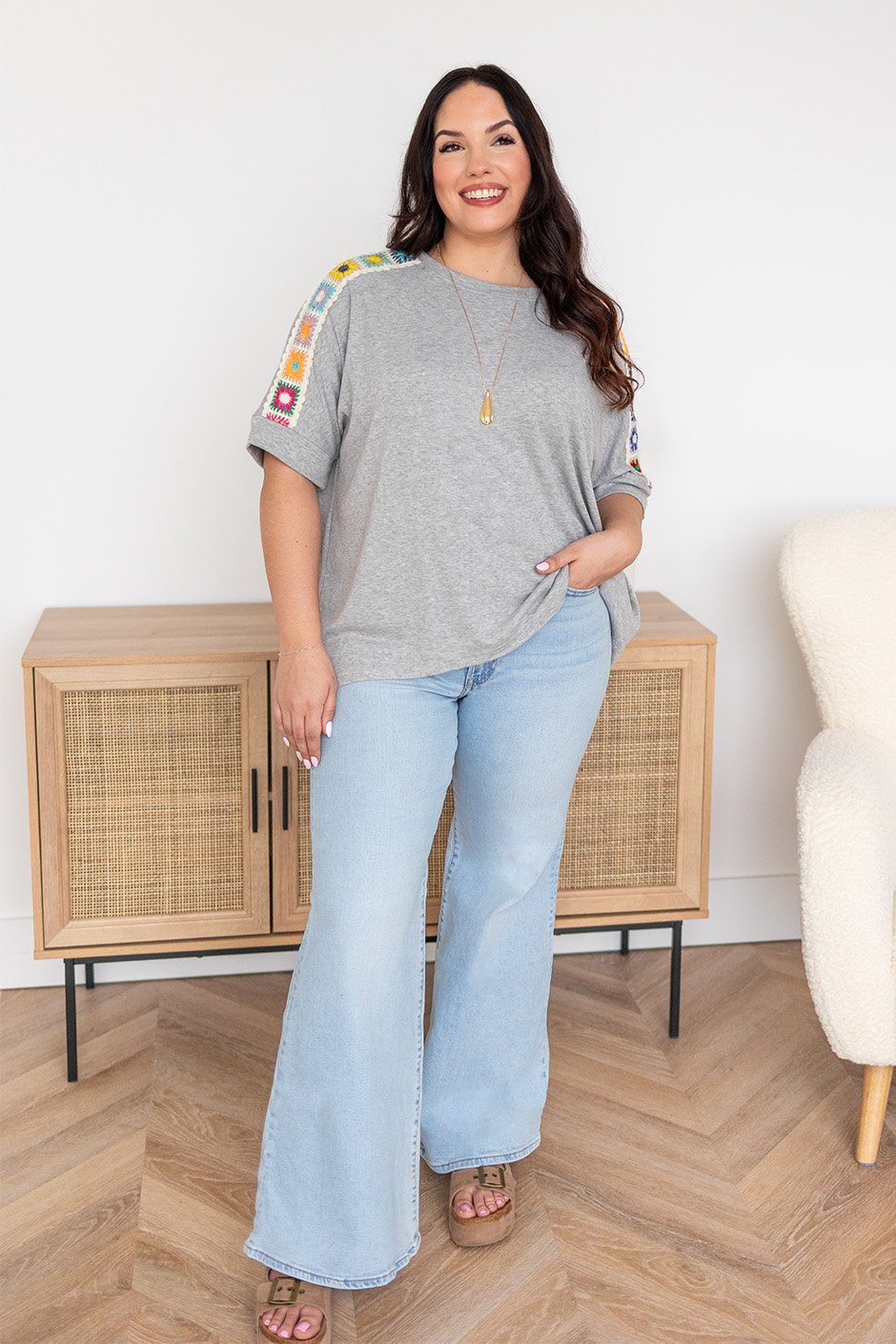 This top is such an easy throw-on-and-go piece! It has a relaxed fit with a comfy medium weight and just the right amount of stretch. The crochet detail on the shoulders adds a cute little something extra. You can tuck it in or leave it loose depending on your vibe. I’m wearing a size L and this is the size I’d stick with.