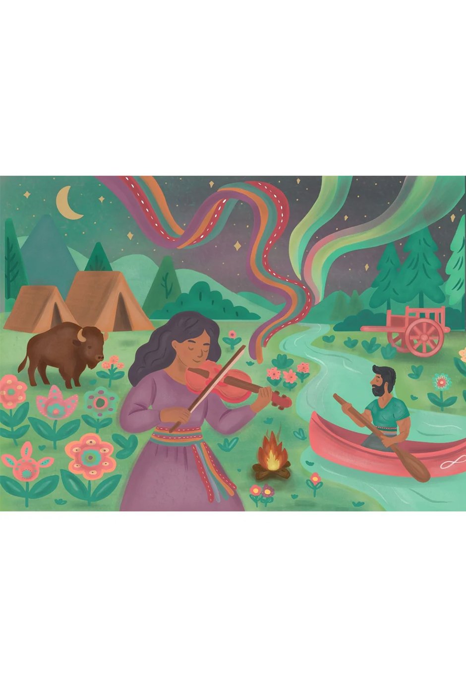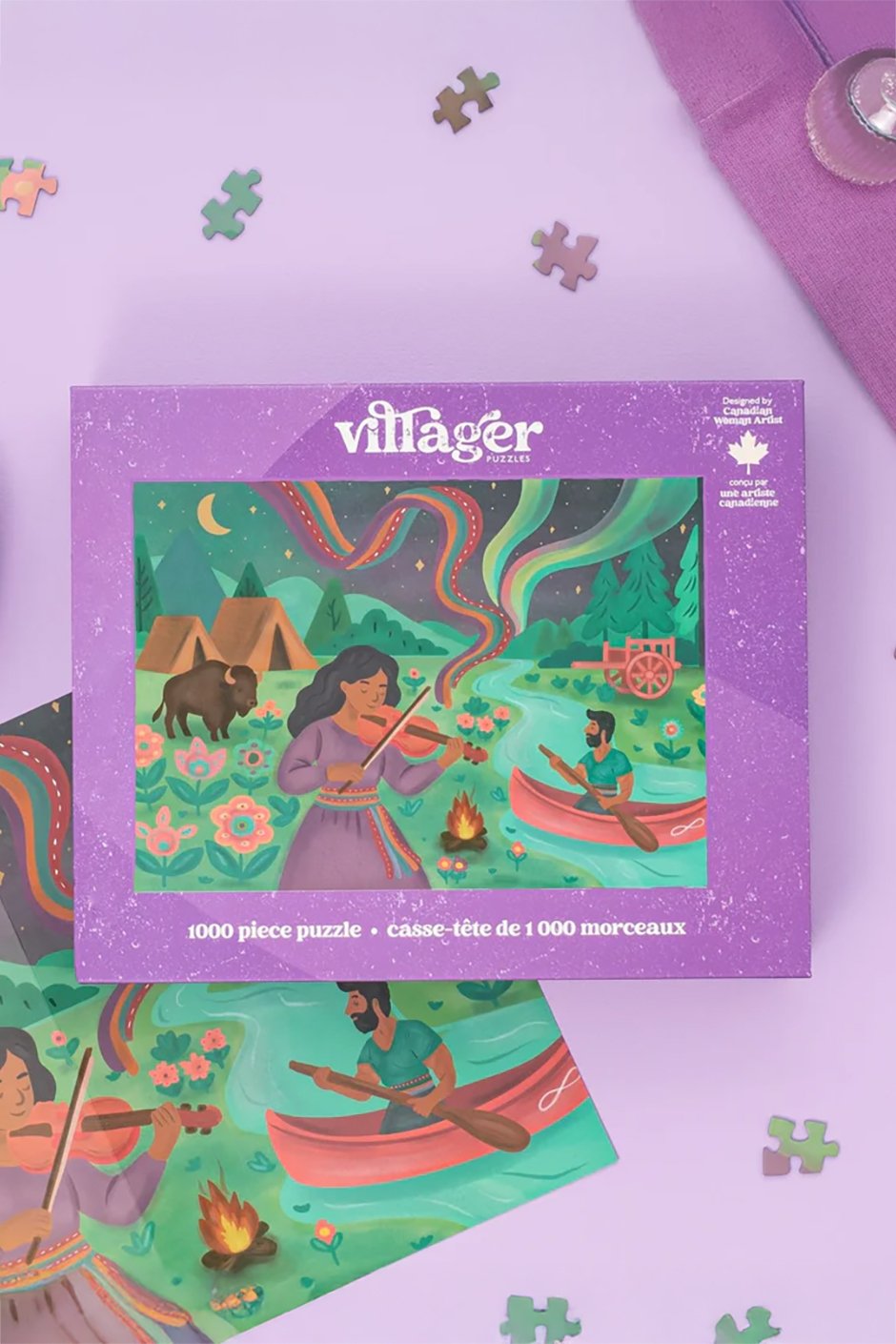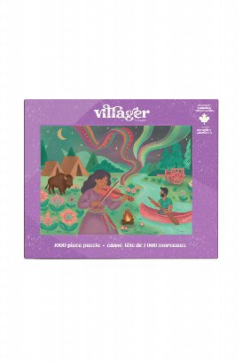 Inspired by Métis culture, this richly detailed scene was created by Ontario artist Véro Filion for the 2026 Villager Puzzles Call for Art. A fiddler plays near a riverside settlement as a paddler drifts by, alongside a bison, a Red River cart, and florals inspired by Métis beadwork, each symbolizing belonging and connection to the land. As the music rises, flowing Métis sashes become the northern lights, carrying culture between earth and spirit, past and present.