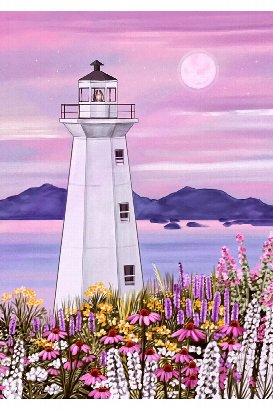 Let calm coastal beauty guide you with a serene and luminous illustration by Ontario artist Susie Armstrong. This peaceful design features a tall white lighthouse rising above a meadow of wildflowers, standing watch over tranquil blue waters and distant island silhouettes beneath a soft, pastel sky.