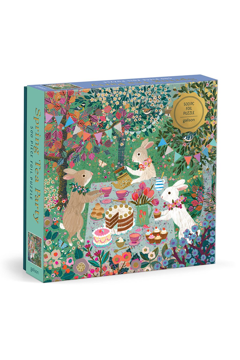 Step into a whimsical world of sweetness and joy with Galison's delightful 500-piece puzzle featuring artwork of bunnies having a picnic amidst cakes, pastries, and flowering trees in a charming garden setting. Each piece of this puzzle is a delightful scene, capturing the playful antics and delectable treats of the bunnies' outdoor gathering.