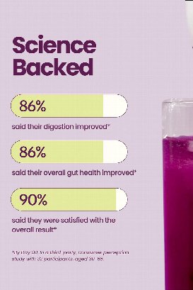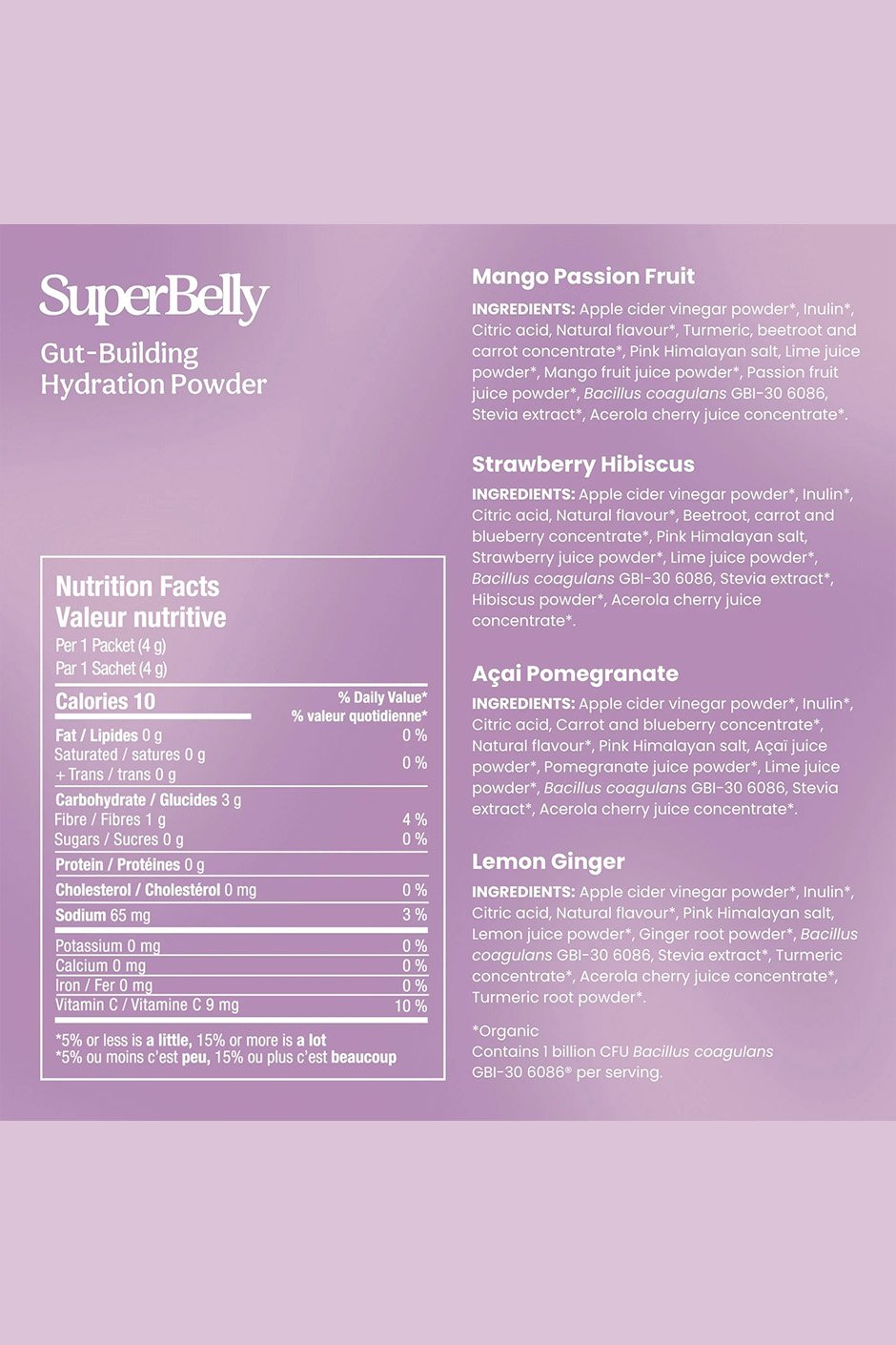 Acai Pomegranate: Apple cider vinegar powder*, Inulin*, Citric acid, Carrot and blueberry concentrate*, Natural flavour*, Pink Himalayan salt, Acai juice powder*, Pomegranate juice powder*, Lime juice powder*, Bacillus coagulans GBI-30 6086, Stevia extract*, Acerola cherry juice concentrate*.