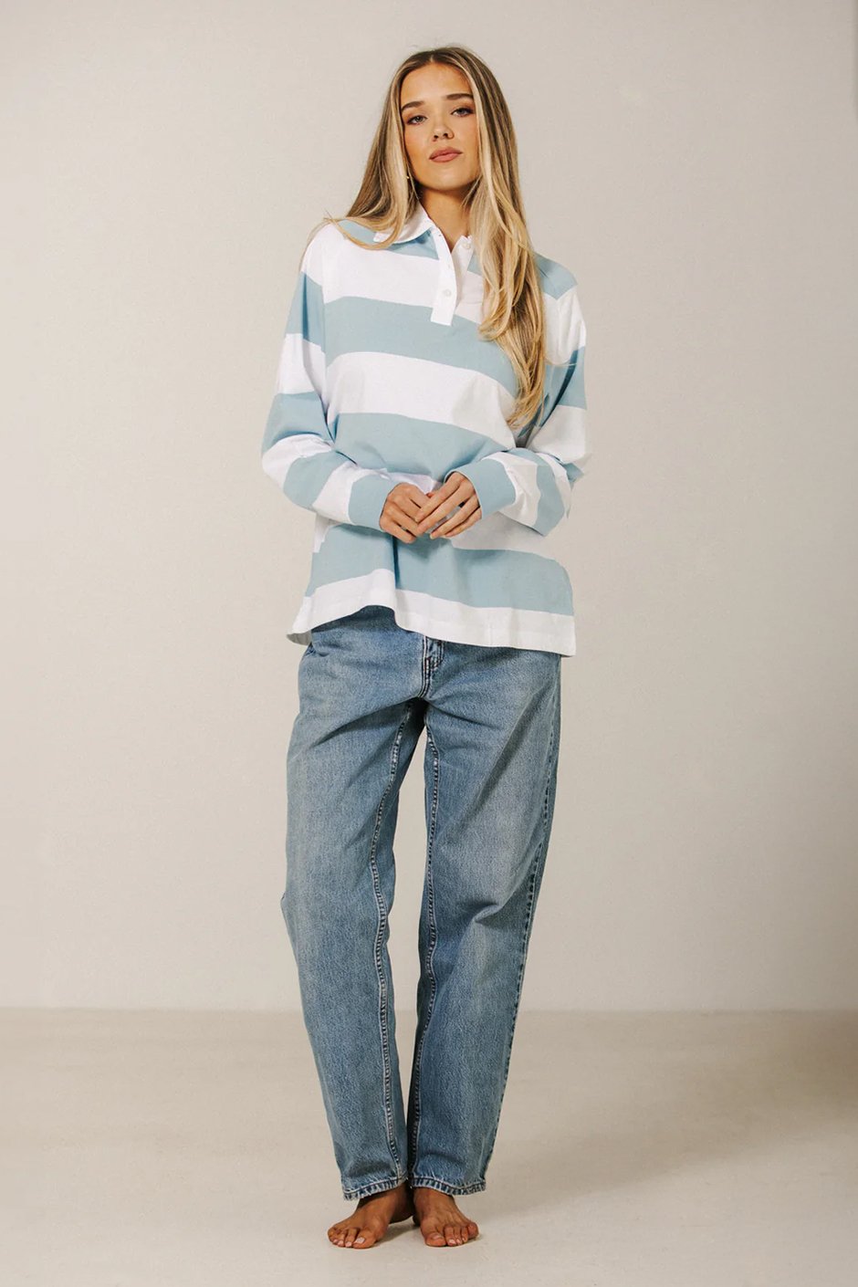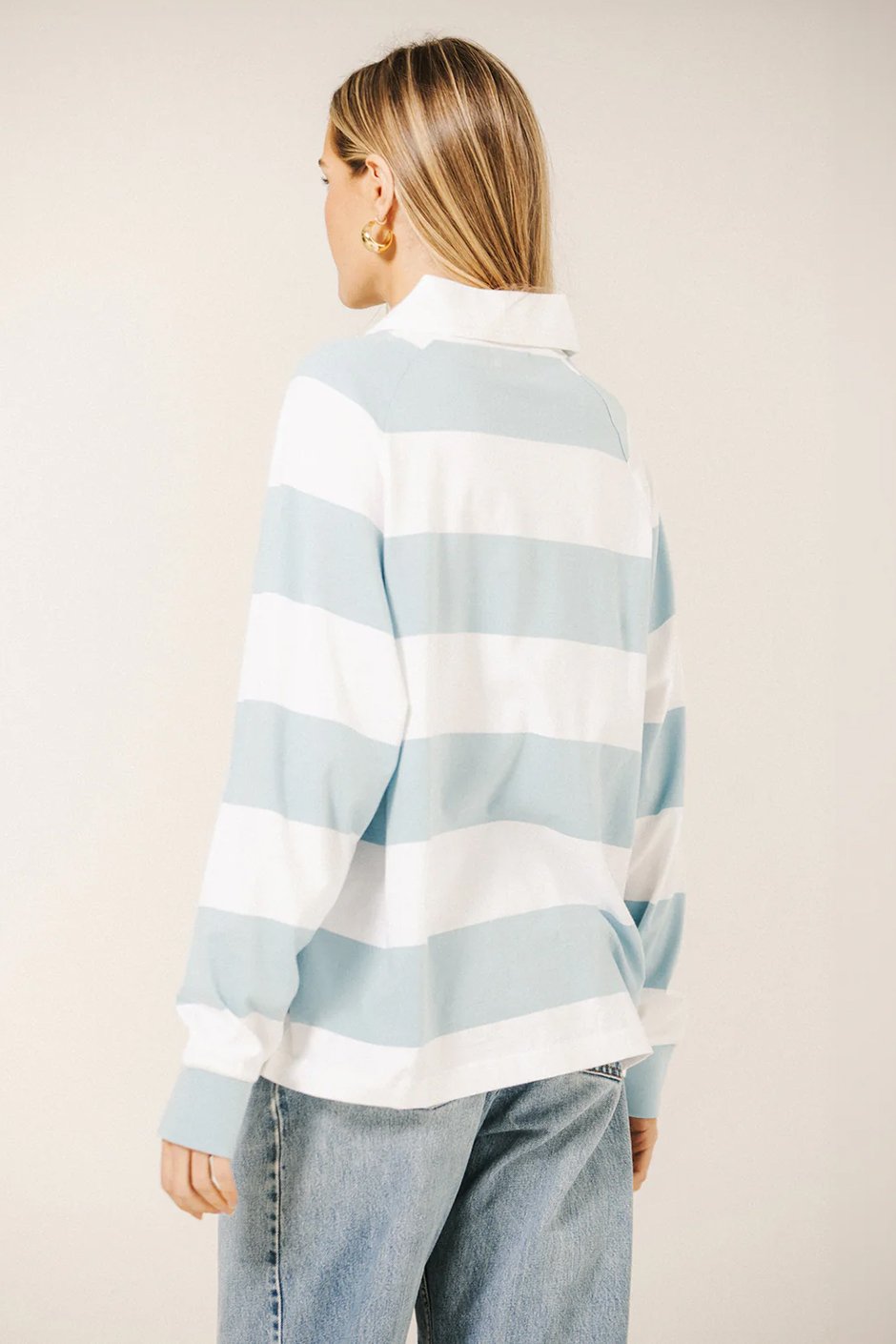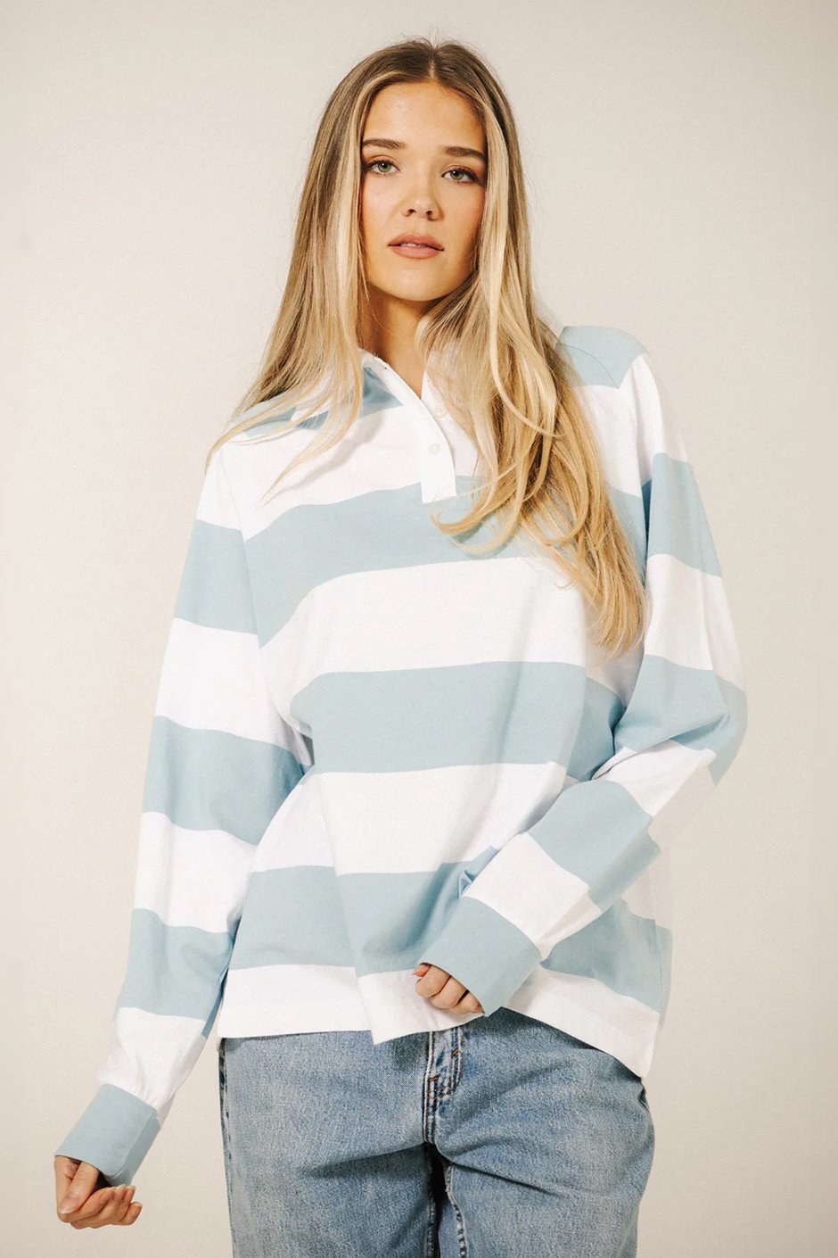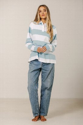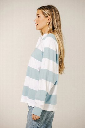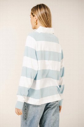 Oversized, playful, and casually chic - this rugby-inspired polo shirt features classic stripes and a relaxed fit, perfect for lounging, layering, or adding a laid-back, preppy touch to any outfit.