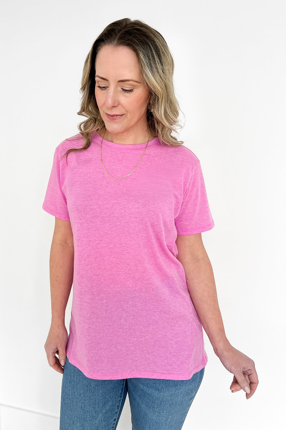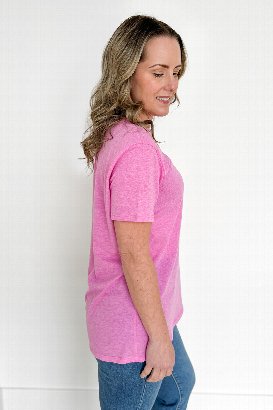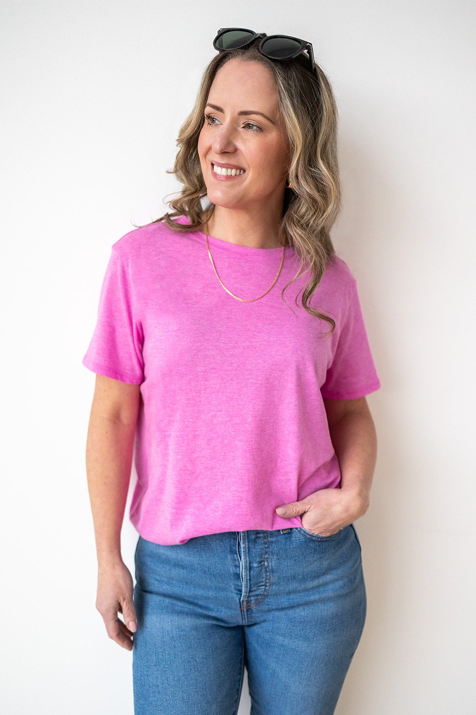 This crewneck tee is a total throw-on-and-go favourite! Soft, light, and breathable, it’s perfect for keeping things easy and comfy all day. I’m wearing a size S and it fits true to size.