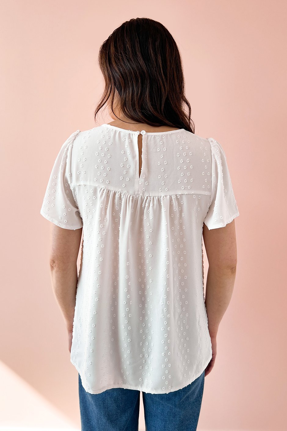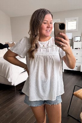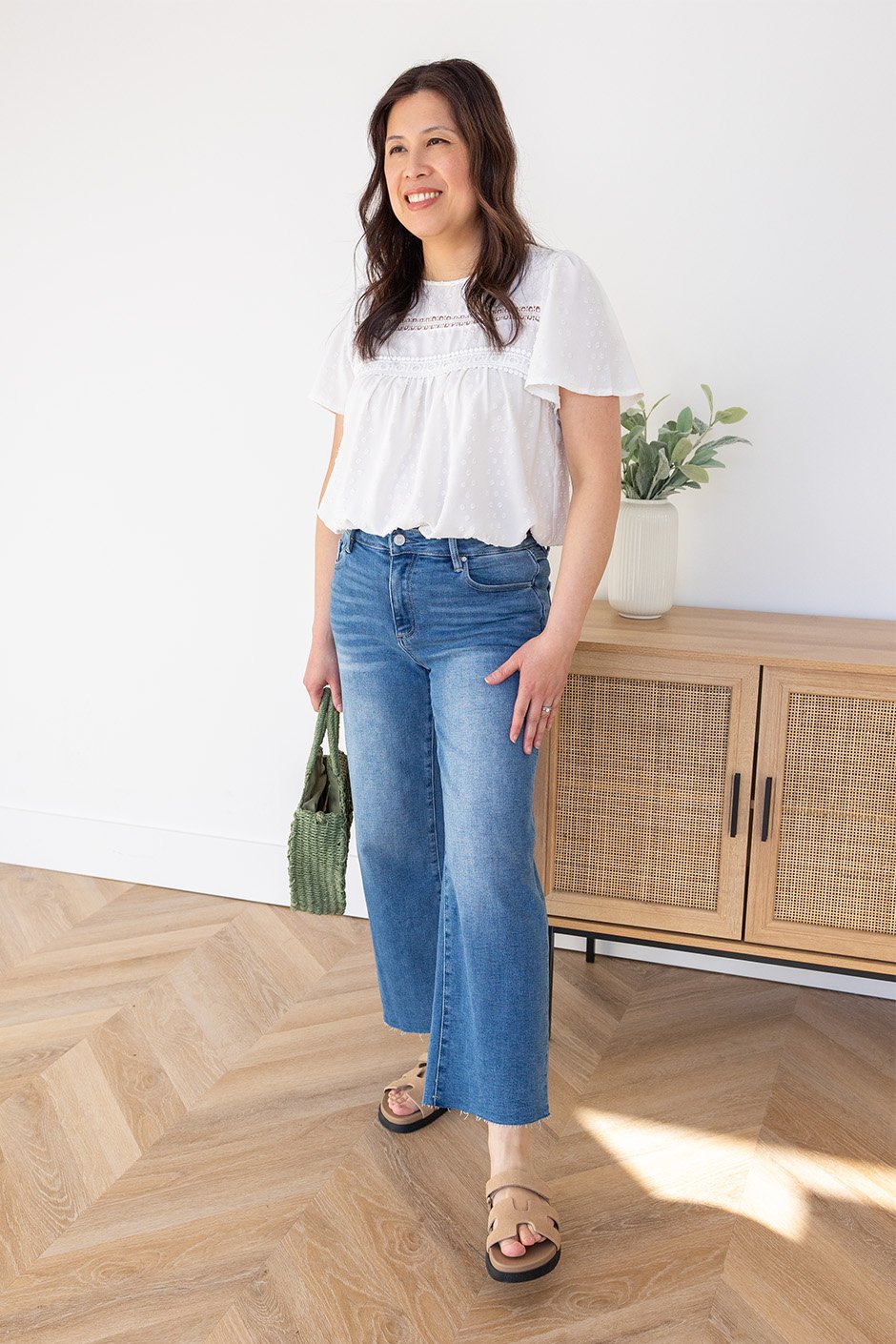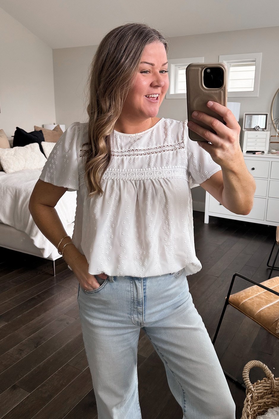 I love an elevated basic and this top is perfect. More than just a t-shirt yet breezy and comfy. It is a lined, woven top and so pretty to wear untucked or tucked in. All of the little details from the fabric to the accents make this extra special. I am normally size Small and I am wearing the photoshoot sample size M here. I do have room so if I wanted true to size, I could wear size S. I like a looser top so I would stick with this size.