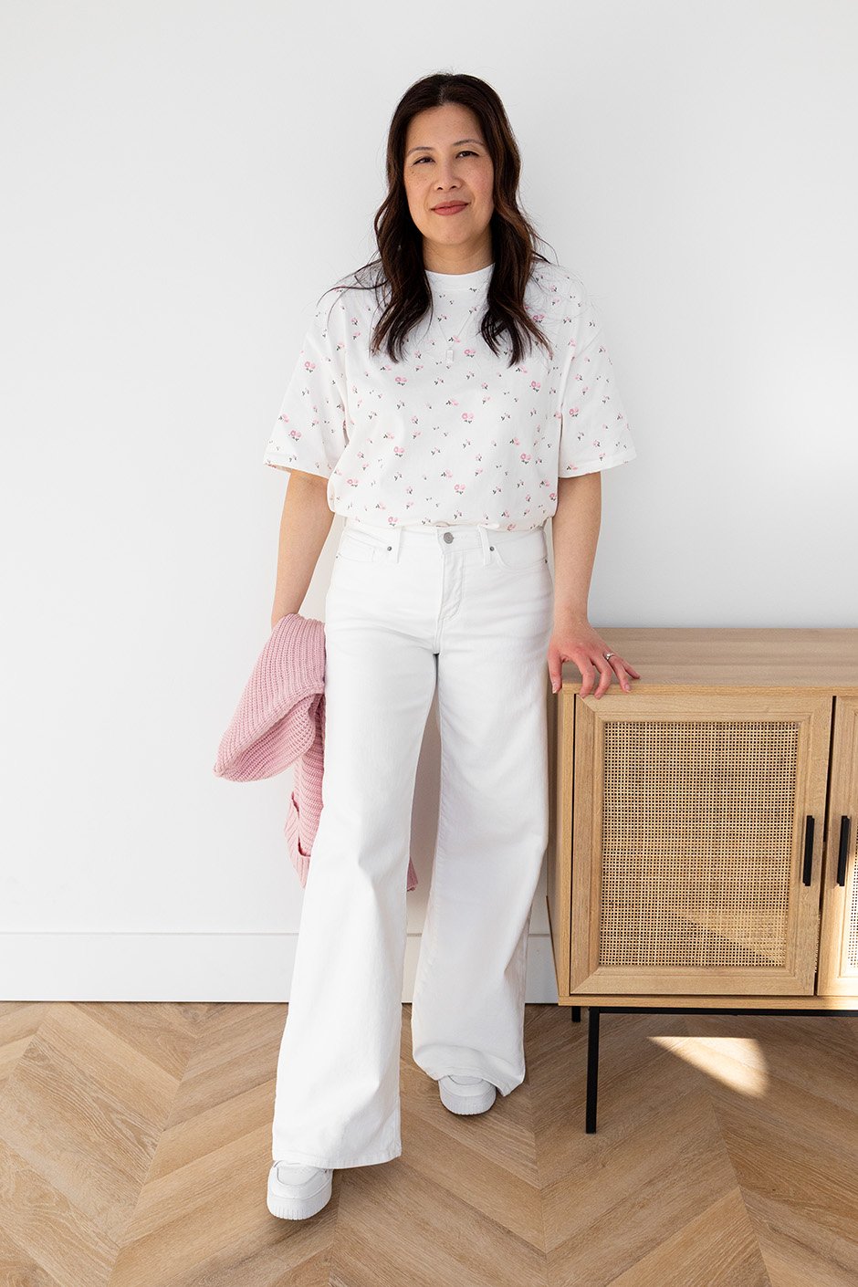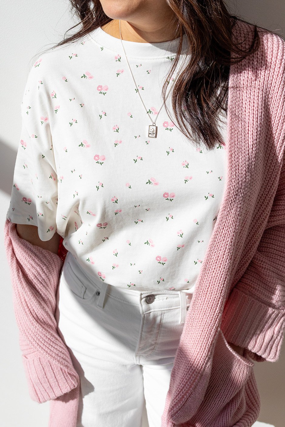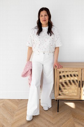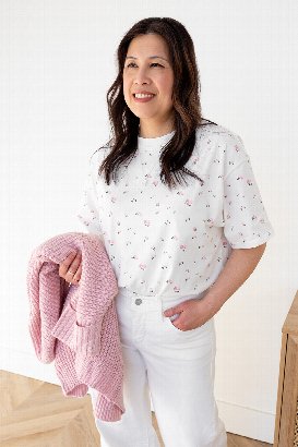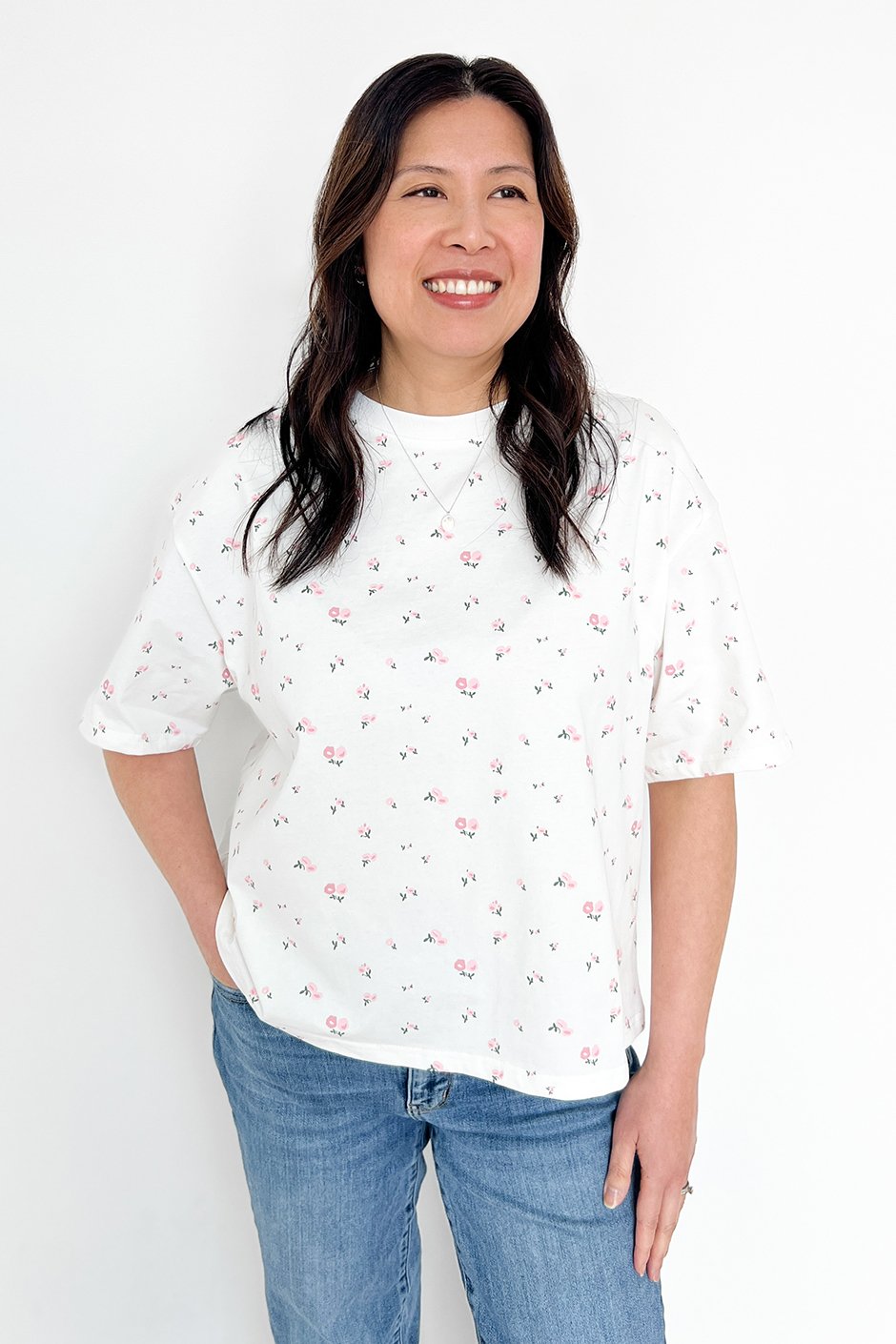 This is like the Always Trendy Boxy Tee but now in this gorgeous floral print. This is a good weight tee and you can definitely feel the quality in this higher price point. This is almost like a french terry. The length can be worn untucked or it is perfect for half or full tucking. I am usually size Small and usually S/M in Brunette The Label. This is the size that I am wearing here and it fits great!