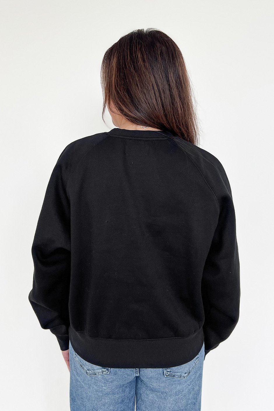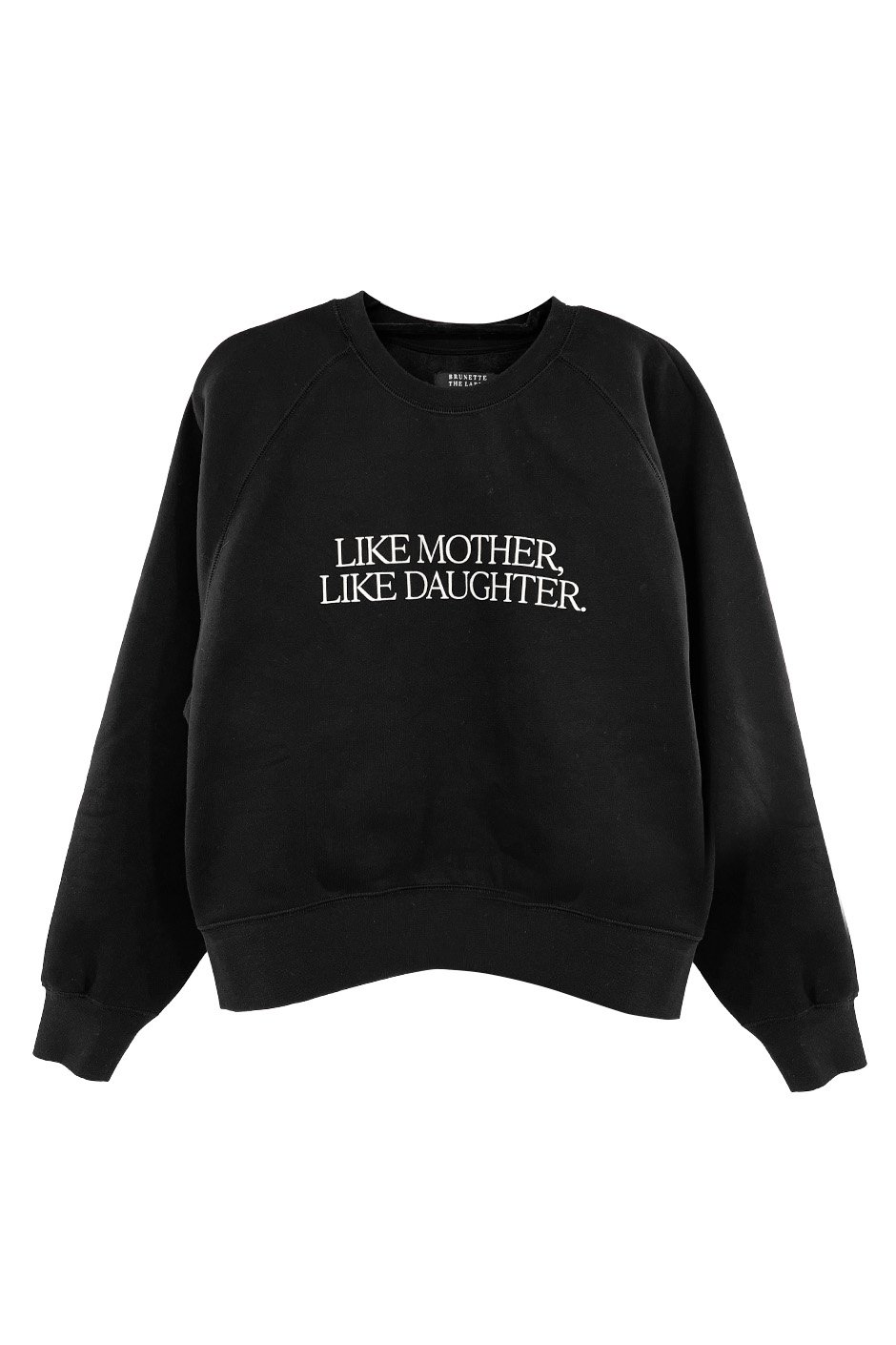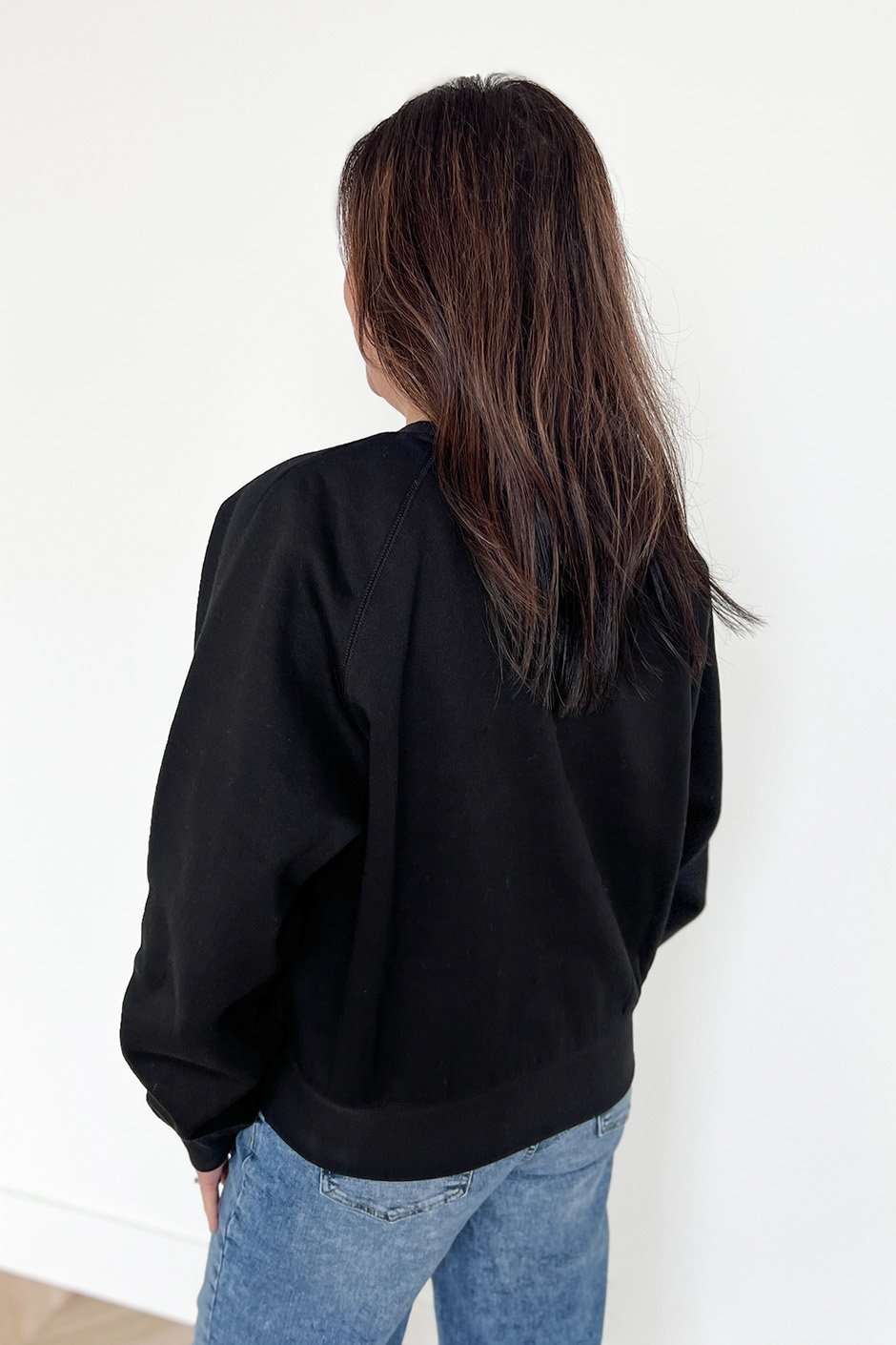 This is new fit for us from Brunette The Label! It is in between the original core crew and the NYBF. Not too fitted and not oversized. The raglan sleeve also gives a nice silhouette and I love that the waistband falls just past the waist, perfect to wear with denim and joggers. The material is the familiar sweatshirt material from Brunette The Label; so soft and cozy. As a black sweatshirt, it washes up really well. Lucky for me, I have one daughter and one son so I can wear both versions!