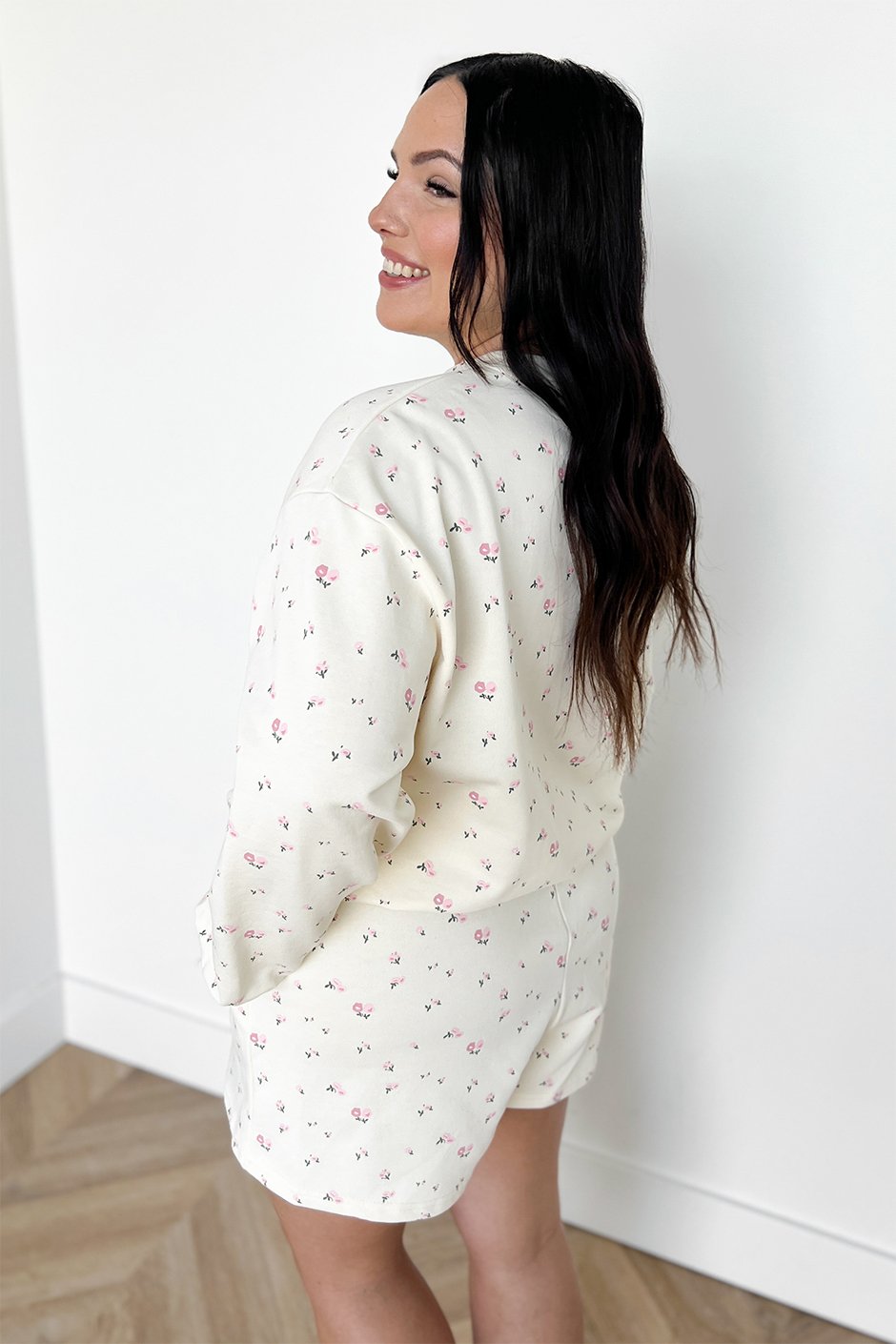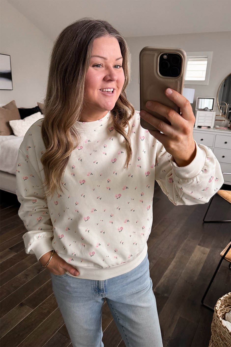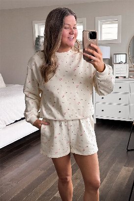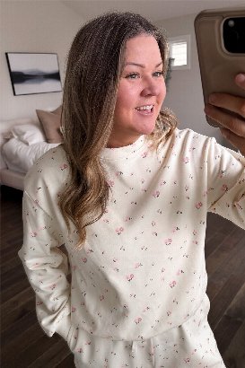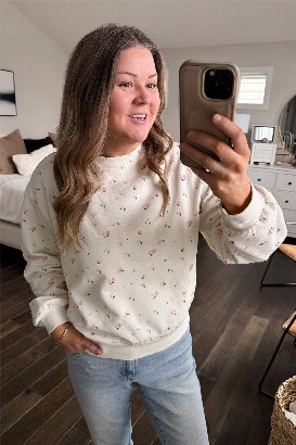 Okay this set is too cute. 🌸 The Flower Girl Sweatshirt is one of those easy, throw-on-and-feel-put-together pieces. The french terry fabric is such nice quality; soft, breathable, and not too heavy, so it’s perfect for right now and into spring. I love the relaxed fit and the little details like the subtle floral print. I normally wear a size L and am wearing the L/XL here, still roomy and comfy without feeling oversized in a sloppy way. If you’re into cozy sets that still look polished, this one’s a yes! 💗
