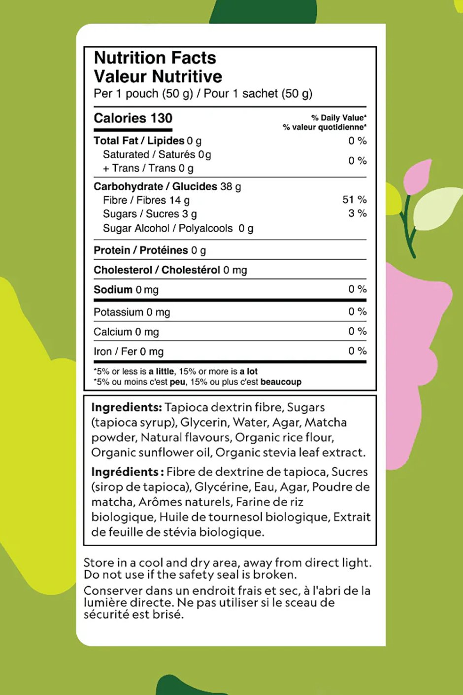 Tapioca dextrin fibre, Sugars (tapioca syrup), Glycerin, Water, Agar, Matcha powder, Natural flavours, Organic rice flour, Organic sunflower oil, Organic stevia leaf extract.