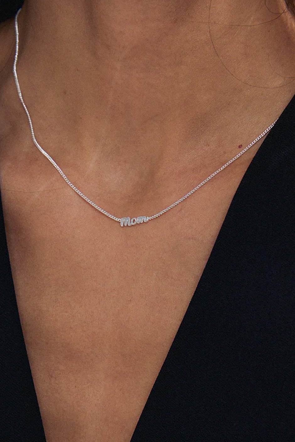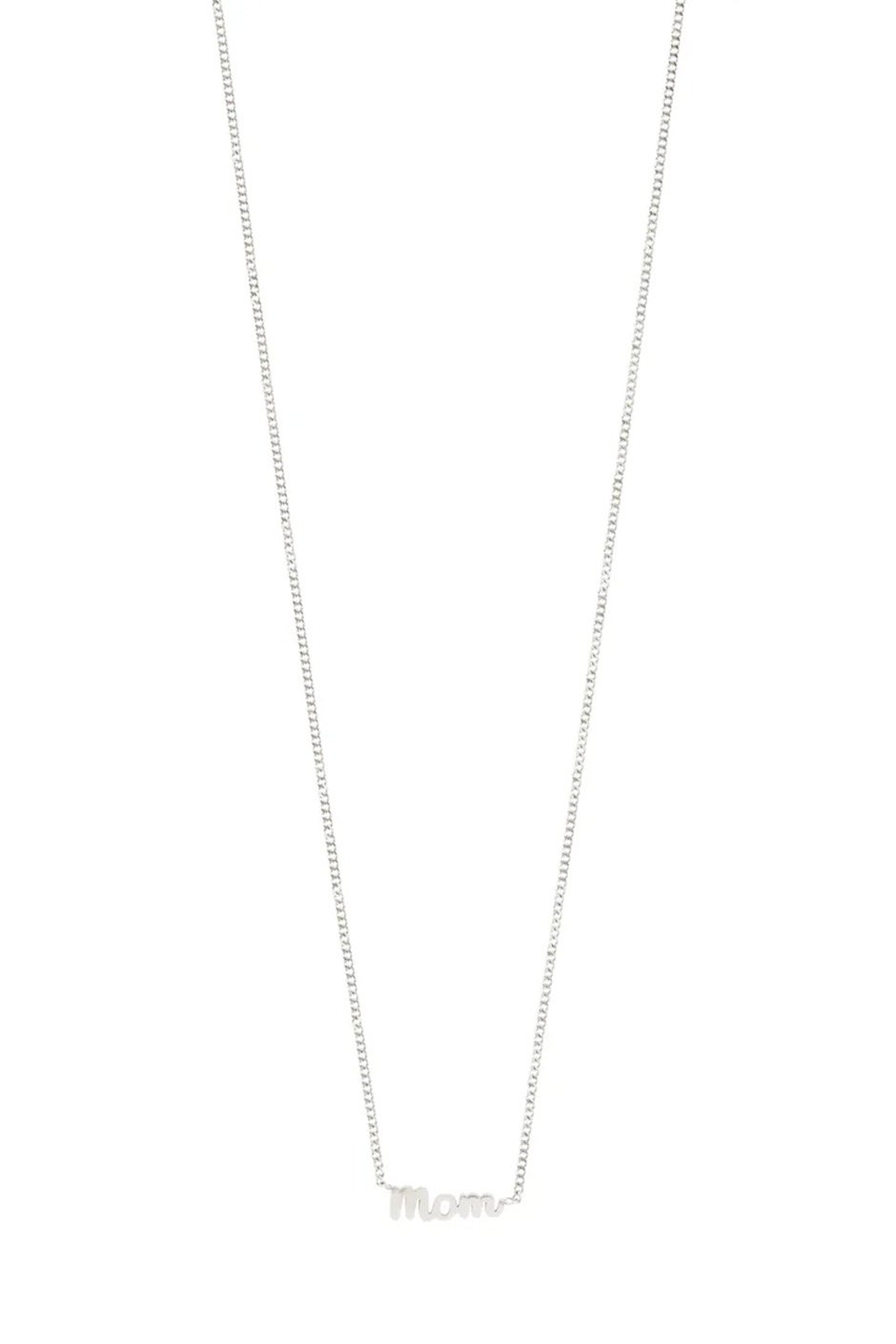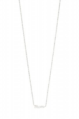 • Petite pendant in cursive script with the word 'MOM'