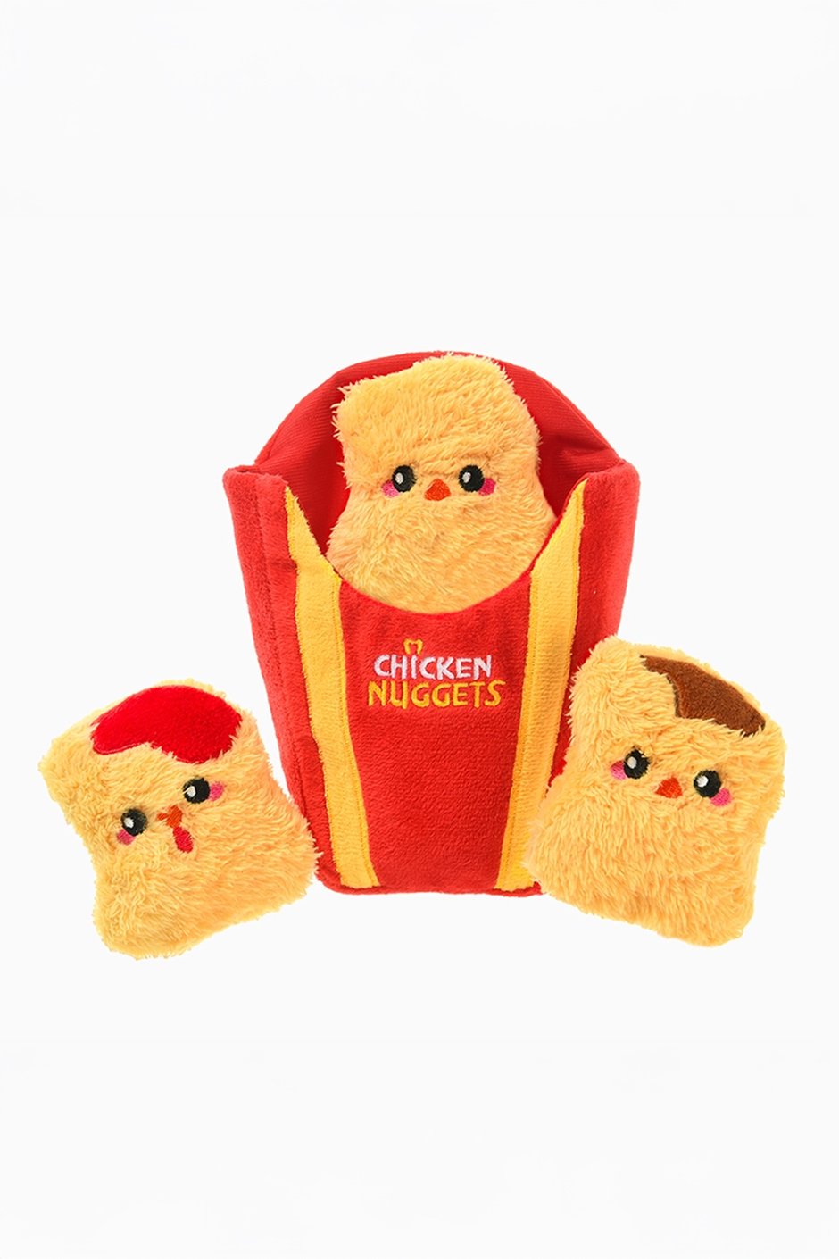 Turn snack time into playtime with this three-piece set has a plush nugget box and three crinkly, squeaky nuggets that beg to be tossed, chased, and carried everywhere. Soft, durable, and full of surprises, it keeps pups busy and bouncing with joy.