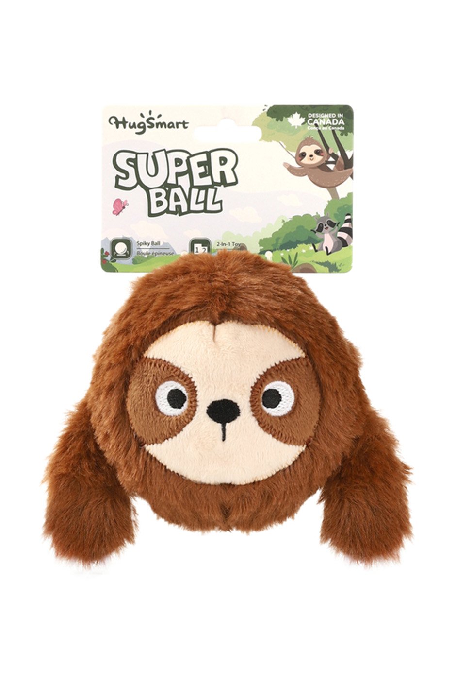 • Plush sloth cover wraps around durable ball
