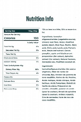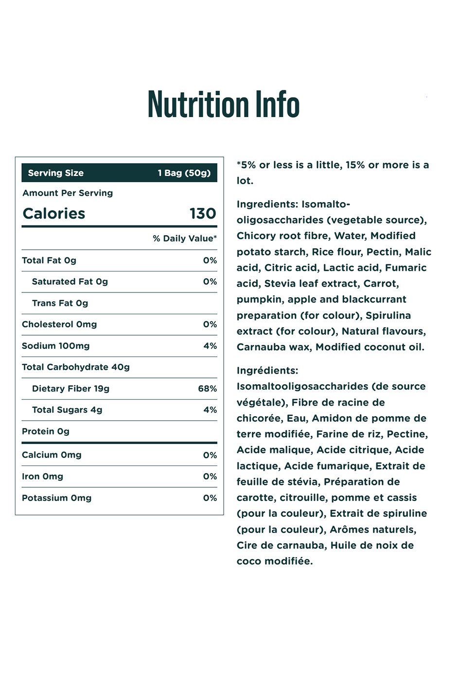 Isomalto-oligosaccharides (vegetable source), Chicory root fibre, Water, Modified potato starch, Rice flour, Pectin, Malic acid, Citric acid, Lactic acid, Fumaric acid, Stevia leaf extract, Carrot, pumpkin, apple and blackcurrant preparation (for colour), Spirulina extract (for colour), Natural flavours, Carnauba wax, Modified coconut oil.