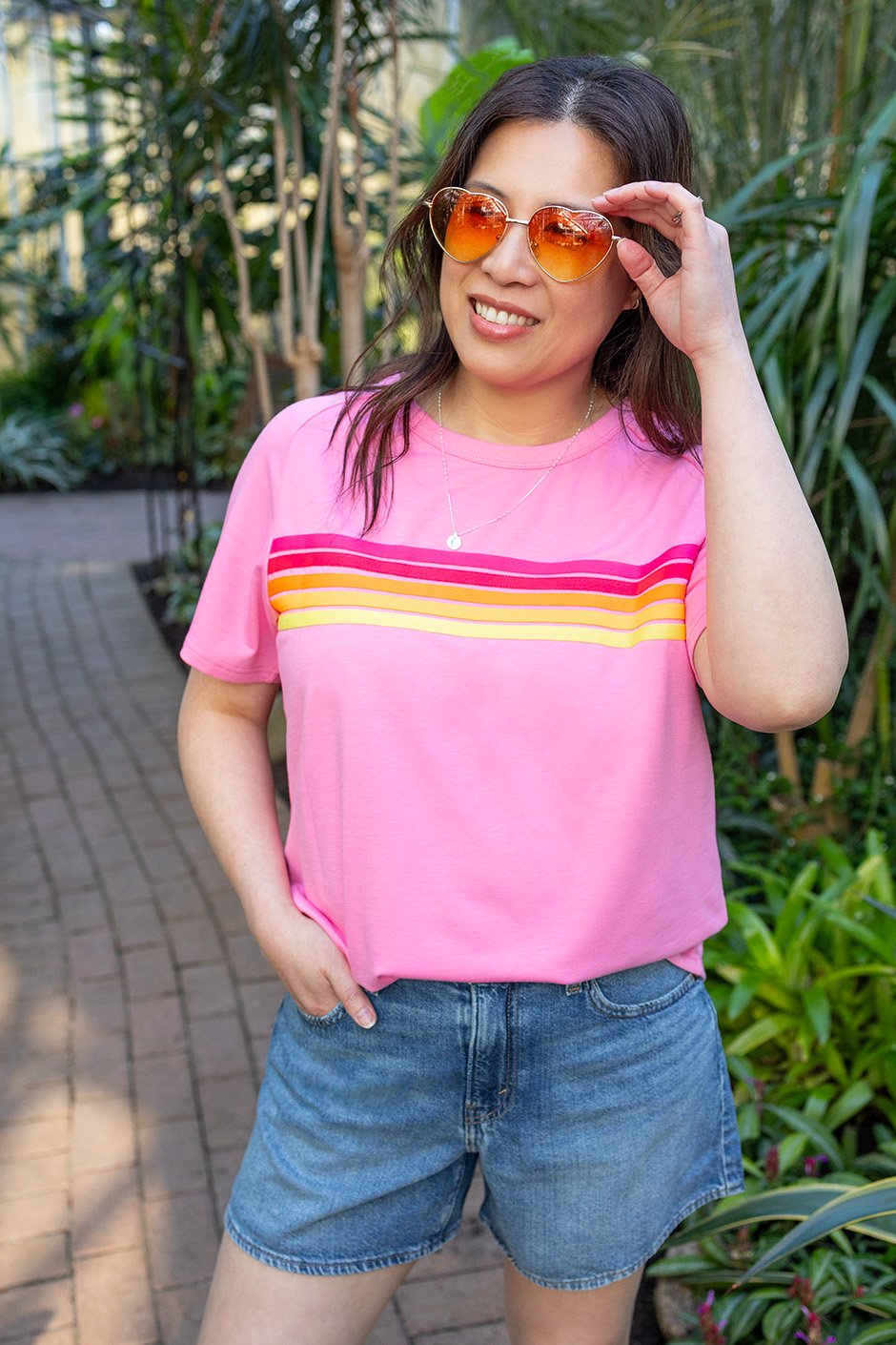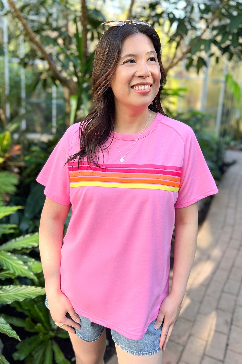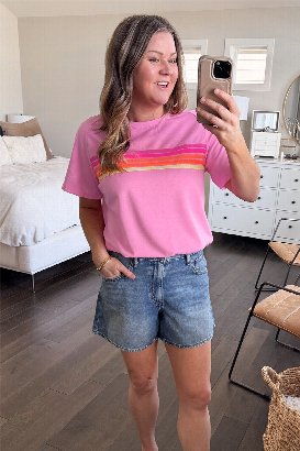 This tee is such a fun, easy piece! The lightweight French terry is soft and breathable, and I love the bright stripe pattern. I tried both the S in Blue and the M in Pink; the M gives a nice relaxed feel, but I’d stick with my usual size S for the best fit. Perfect for adding a little color to your everyday look!