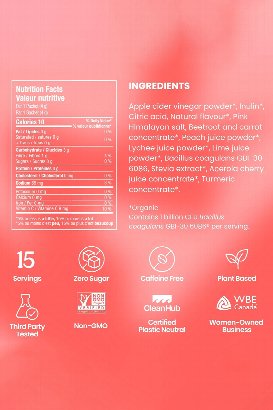 Apple cider vinegar powder*, Inulin*, Citric acid, Natural flavour*, Pink Himalayan salt, Beetroot and carrot concentrate*, Peach juice powder*, Lychee juice powder*, Lime juice powder*, Bacillus coagulans GBI-30 6086, Stevia extract*, Acerola cherry juice concentrate*, Turmeric concentrate*.