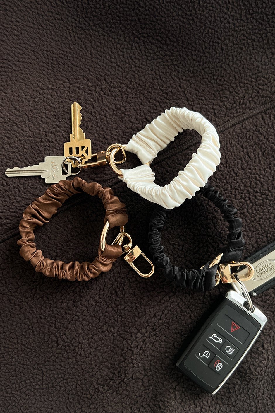 Cute and functional? Yes please! This scrunchie keychain wristlet keeps your keys secure while adding a stylish touch to your everyday look. Easy to slip on your wrist so you never lose your keys, with a gold accent for a little extra shine.