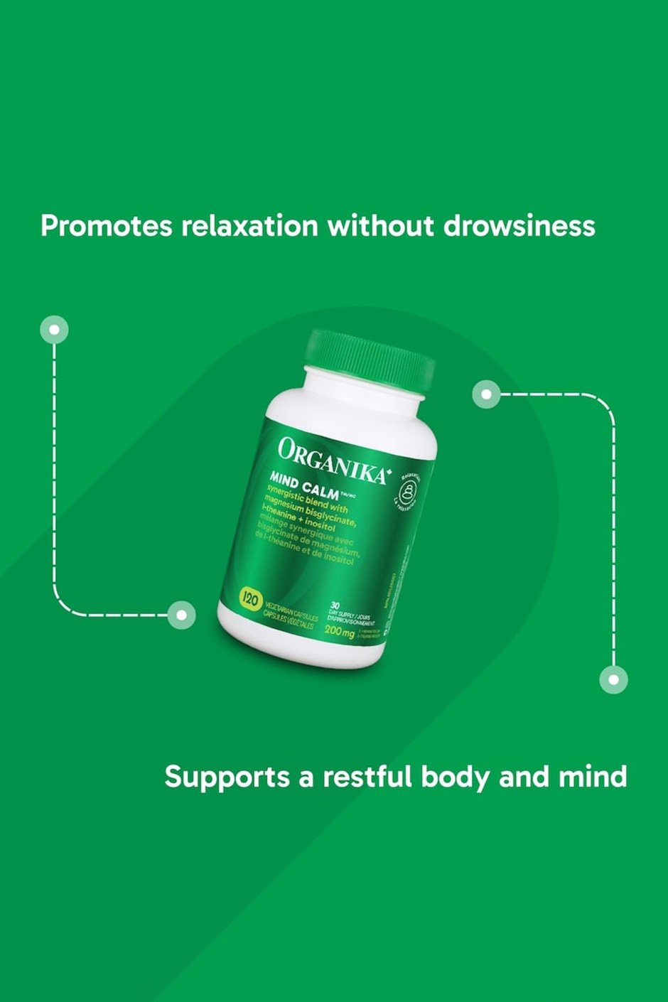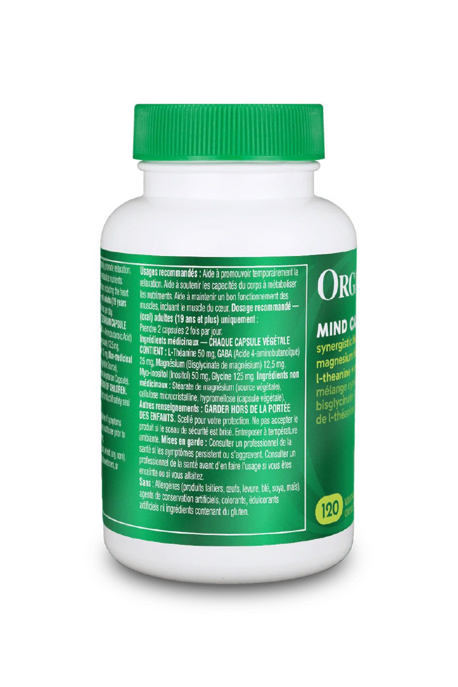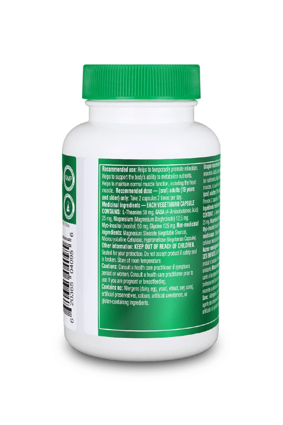 MEDICINAL INGREDIENTS - EACH VEGETARIAN CAPSULE CONTAINS: L-Theanine 50 mg, GABA (4-Aminobutanoic acid) 25 mg, Magnesium (Magnesium Bisglycinate) 12.5 mg, Myo-Inositol (Inositol) 50 mg, Glycine 125 mg