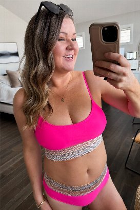 I absolutely love this swimsuit. The hot pink colour is such a standout, and the overall design feels both fun and flattering. I was unsure how the elastic detailing would feel, but it is incredibly comfortable. It has the perfect amount of stretch, not too tight and not loose at all. The top is especially impressive, offering great coverage and support without feeling restrictive, even for a fuller bust. I am wearing the medium and feel very secure in both the top and bottom. The elastic stretches perfectly without digging in or creating any pressure, and I don’t feel like I am spilling out at all. The adjustable straps make a big difference, and I love that they sit on the shoulders instead of around the neck for added comfort.