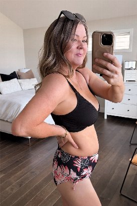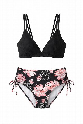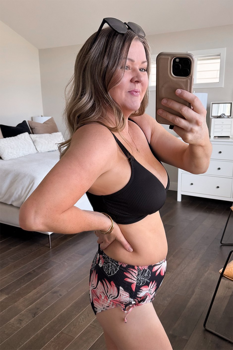 Such a cute and comfortable set. I love the mix of the classic black top with the patterned bottom, it feels fun but still easy to wear. The bottoms are a true mid rise and feel very secure, and the side ties (non-functional) add a bit of extra coverage through the thighs, which I really appreciate. The top has a more relaxed fit that gives a bit of a “boobalicious” look, but in a way that still feels secure and supported. I am wearing the medium and found it to fit great. The bottoms feel secure without digging in, and the top gives a flattering shape while still feeling comfortable. I especially love the continuous band and double straps, which make it very easy to wear without any pressure points.