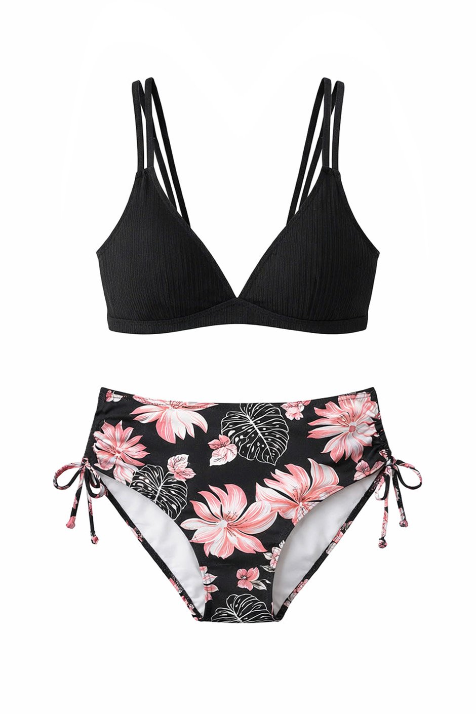 Chic and effortlessly flattering, the Seaswept Bikini Set pairs a classic black top with patterned bottoms featuring subtle ruching for a flattering touch. This two-piece set is equal parts timeless and playful, made for easy days by the water.
