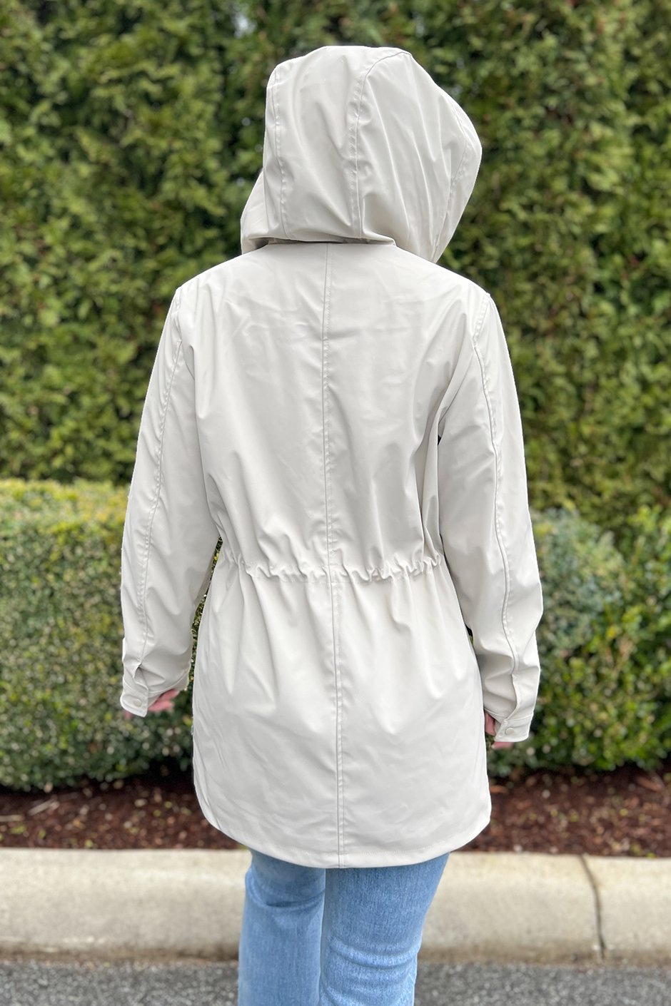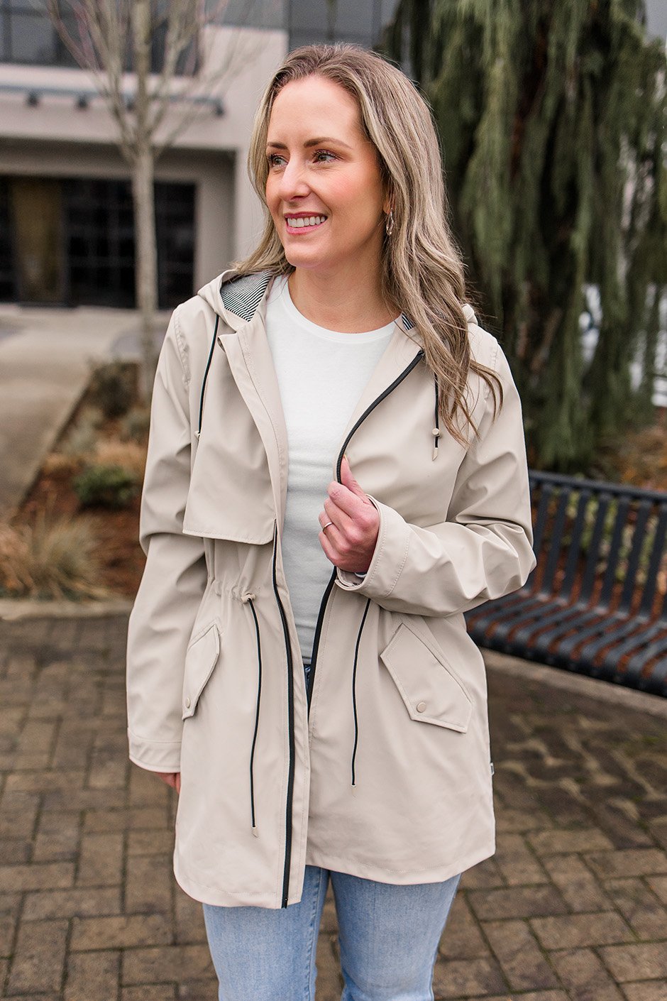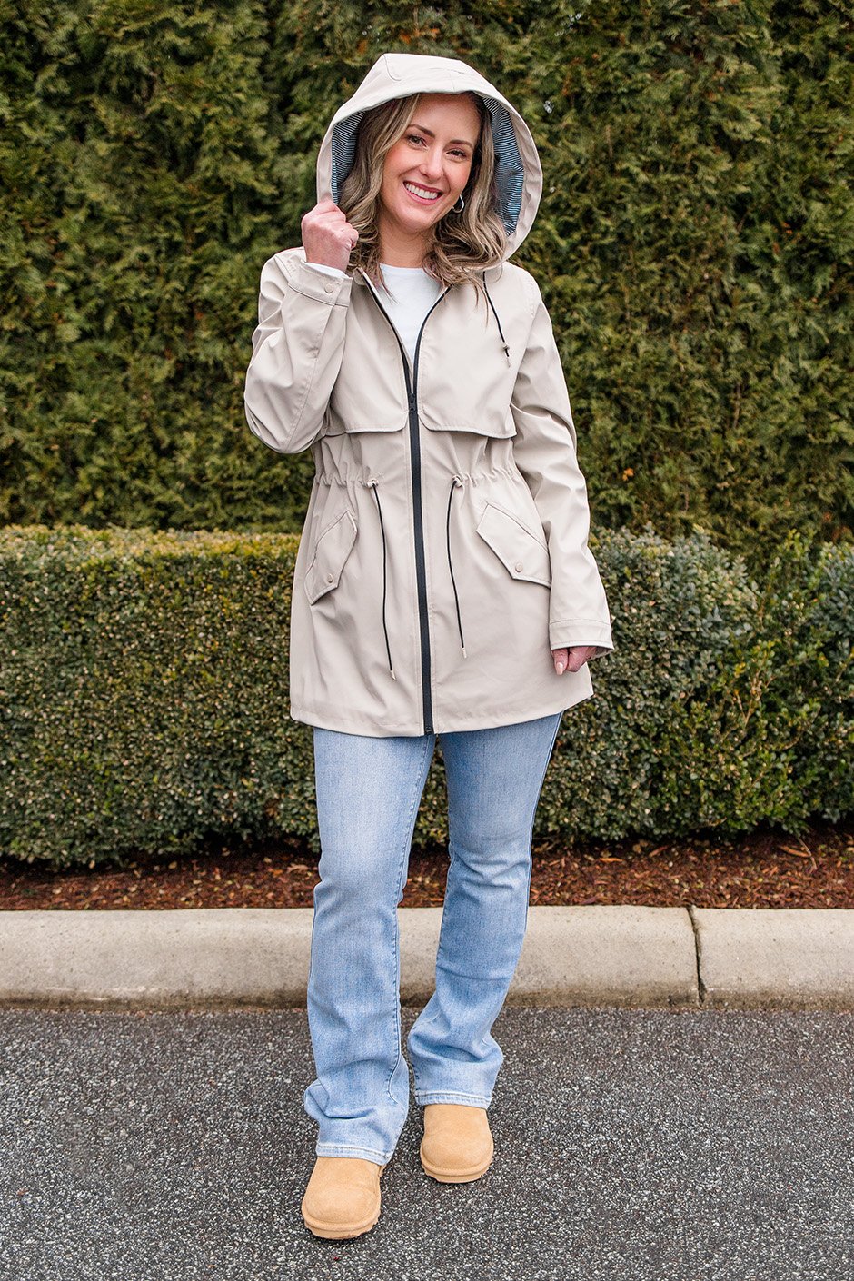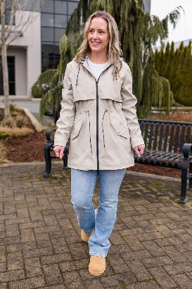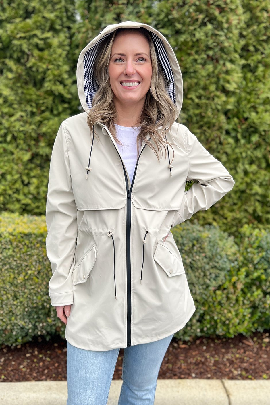 This is the kind of raincoat you actually want to wear! I’m wearing a size small and the fit is perfect, especially because it’s so adjustable at the hood and waist. It’s comfortable and lightweight with a soft lining, and the striped detail inside is super cute. It keeps me dry and blocks the wind without feeling bulky, and the snaps and pockets make it super practical for everyday wear. Love!