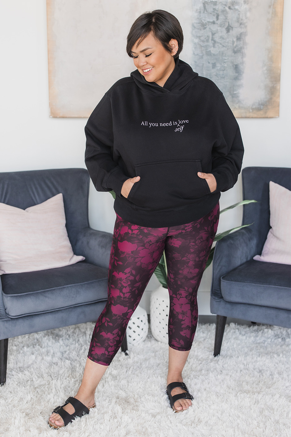Oh hello beautiful new crops! The pattern on our new Exclusives is stunning!! They are just the most beautiful and subtle floral print, and I am in love!! When I go to the gym, I require all of my leggings to have pockets, so these are a winner! They are plum backed too which means they are definitely not see-through! I am wearing the sample size XL but would get a L, which is my true size for our 8-way Exclusives.