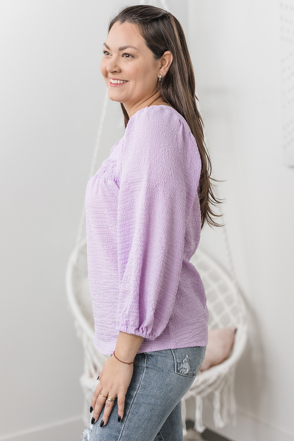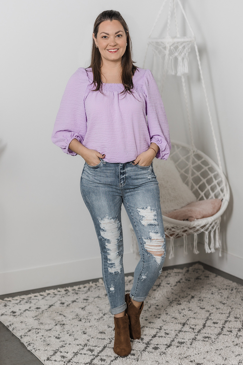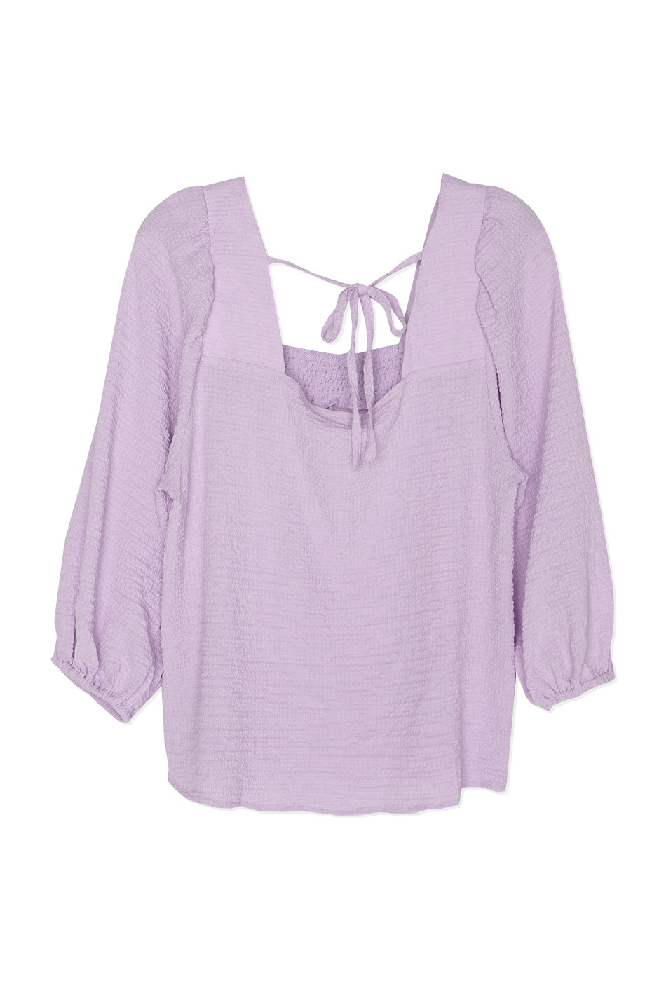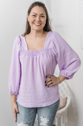 Live out your fairytale dreams in this pretty top! It is made of a lightweight crepe material and has plenty of feminine details. The ruched square neckline is so flattering and unique, and we love the 3/4 puff sleeves. It also has ties at the back for your perfect fit!