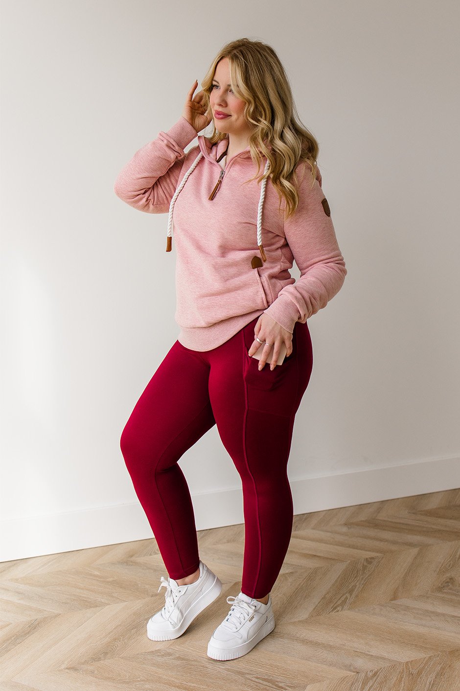 These leggings are amazing! It's the same buttery soft brushed fabric as our cozy down leggings but with pockets!! You know the feeling of being bundled up with a cozy blanket and your legs are freshly shaven? That's what these leggings feel like when you wear them. I love how big the side pockets are; they can easily hold my phone when out and about. I'm wearing the size small and would size up to the medium to get extra room for comfort in the waistband and fabric overall.