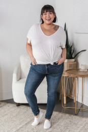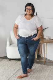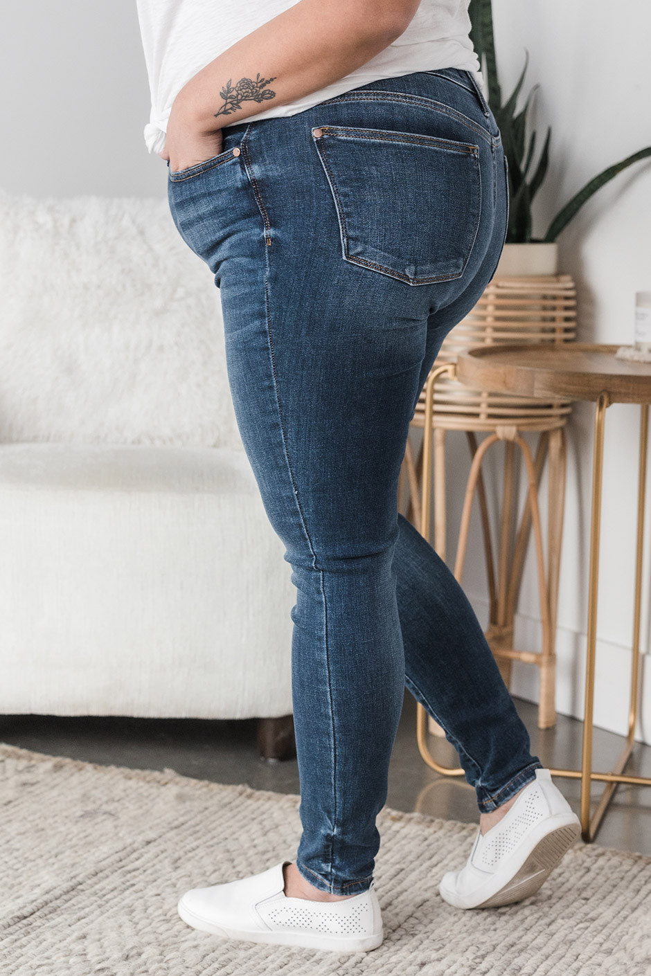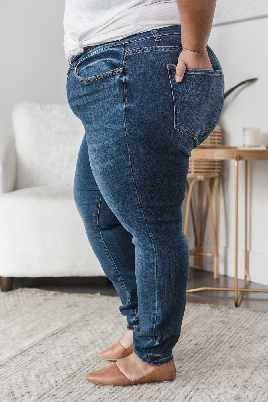I honestly LOVE Judy blue jeans! They are designed so well for a plus-size woman! I have struggled looking for a jean that fit well in the waist, hips and my booty! When I met Judy Blues Jeans - I have been loyal since! These skinny jeans are soooooo comfortable! The rise is perfect, not too high and definitely not low and such a great dark denim colour! Perfect for a spring transition! They sit well on my waist and fit well in my hips. I am wearing at size 22W but I can easily go down a size 20W as its stretches in all the right areas! Cha-ching, another classic jean added to my closet!