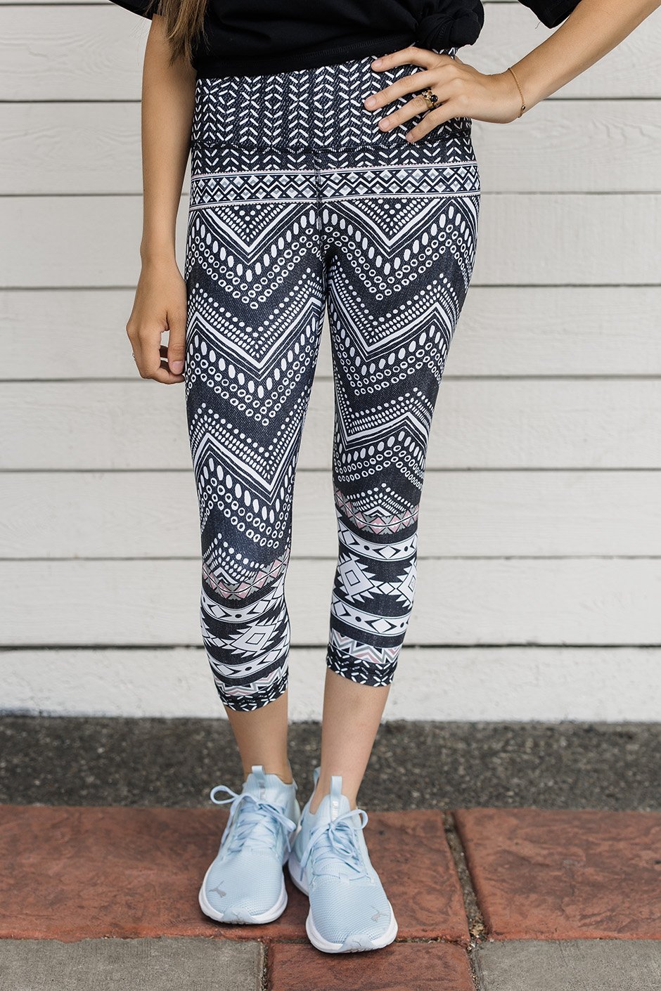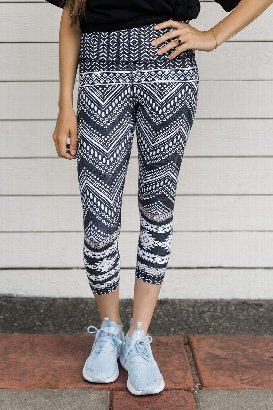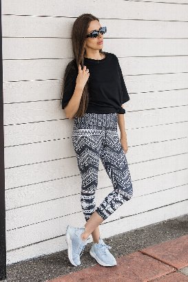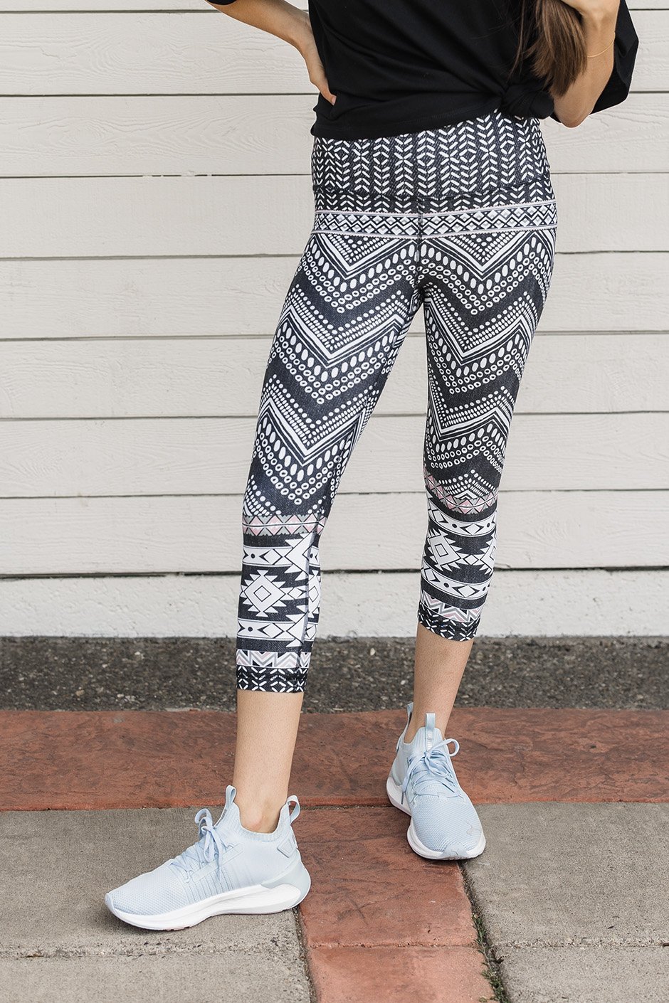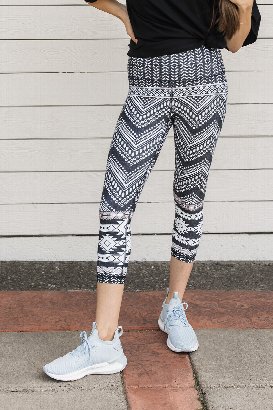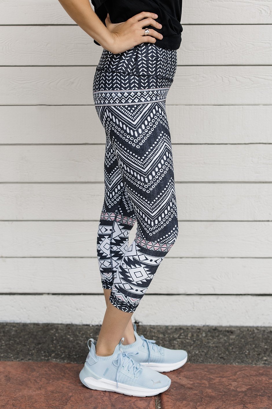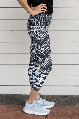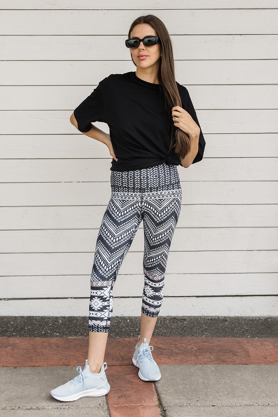 I am wearing the Southwest Crops 12 inch rise in XL. The stretchy fabric is just the right thickness, not thin and not too thick. The sizing is true to size, as I am a 5' 10" amazon, and the leggings didn’t constrict my thighs or calves. Super comfy! They were super easy to put on, and I feel the nicest tummy flattering with the 12 inch rise. The gorgeous pattern speaks to my soul, though I may be a little biased (wink wink) The tribal on-trend design has me walking tall and proud as a strong Indigenous woman, and I know I am going to get a lot of wear out of these.