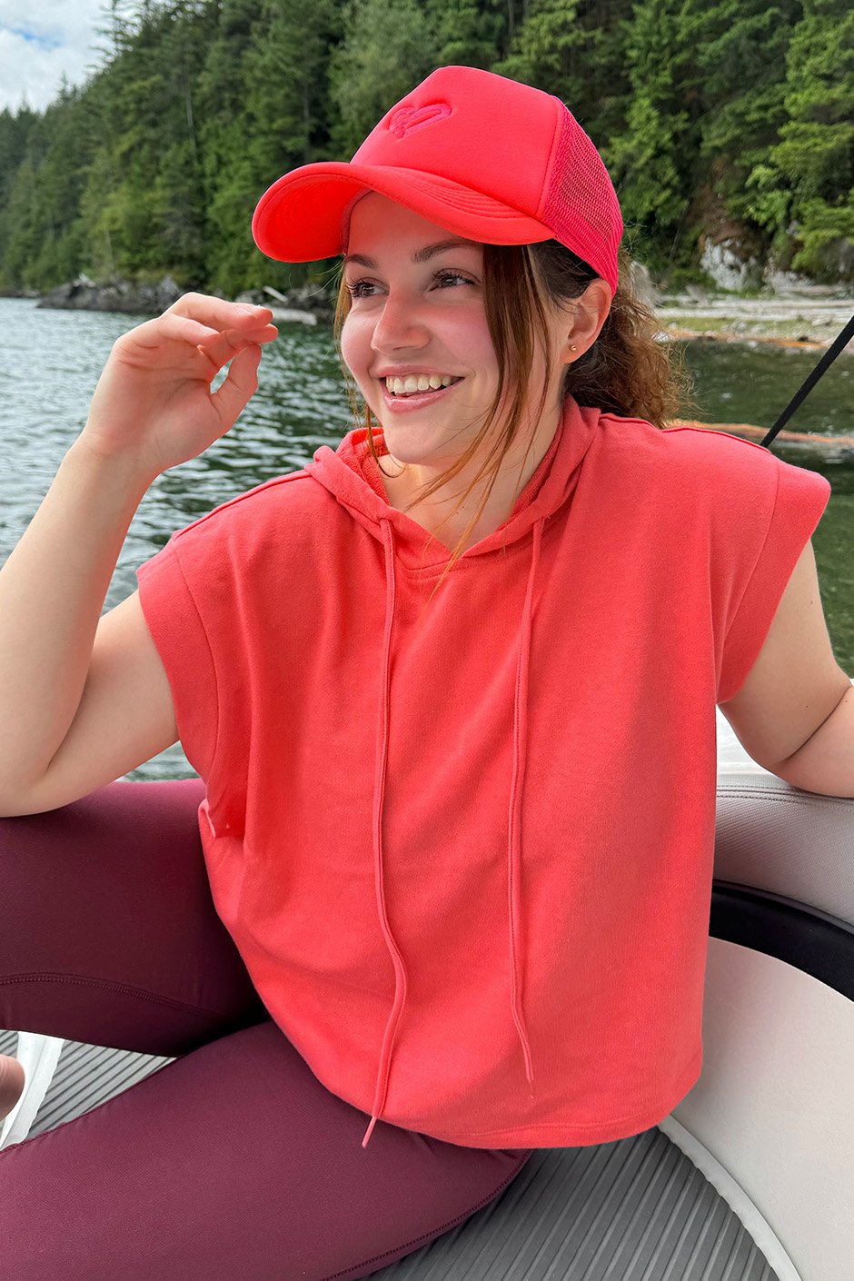 Meet your new essential! This sleeveless hoodie is a cropped version of our Hoodwinked Casual Tank, perfect for showing off those arms. Made of lightweight, breathable fabric with plenty of stretch, this 80s-style muscle tank is "totally rad!"
