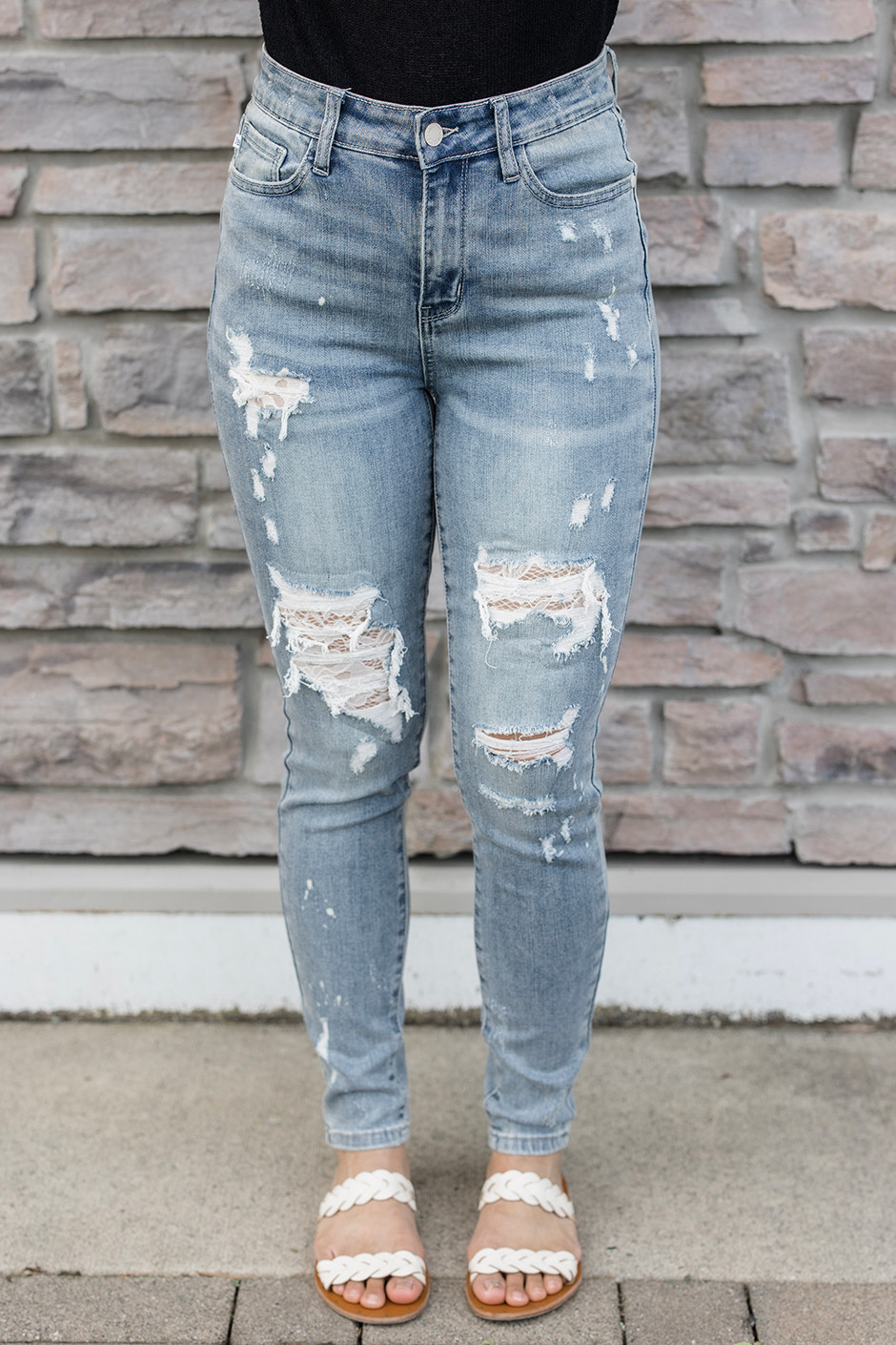 Judy blue does it again!! These are the best take on distressed denim! The distressing actually has lace patches in it!! So cute! These have a true denim feel with the stretch we know and love! These lighter wash and lace details are so fun for summer! I am wearing a size 13 which is my true size with this brand!