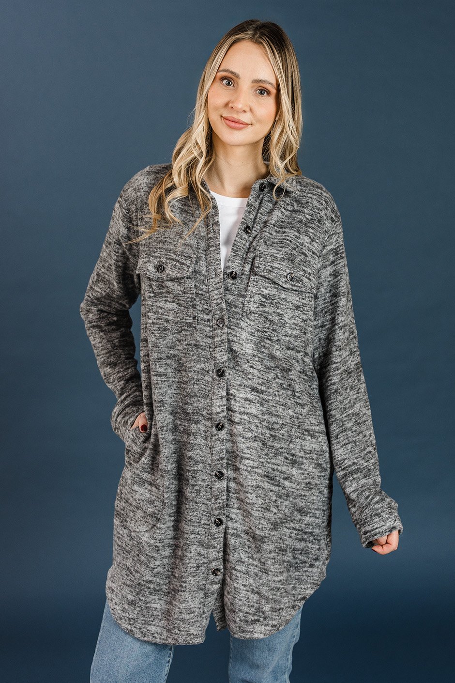 I know how much everyone loves these cardigan and I totally understand why!! This fabric is so soft. I love that the length comes just past my bum and the sleeve length is perfect for me! I love having buttons on the chest pockets so that my things are secure. I'm wearing my true size large and I love the fit!! If I wanted to wear a thicker hoodie or sweater underneath, I would size up to the XL.