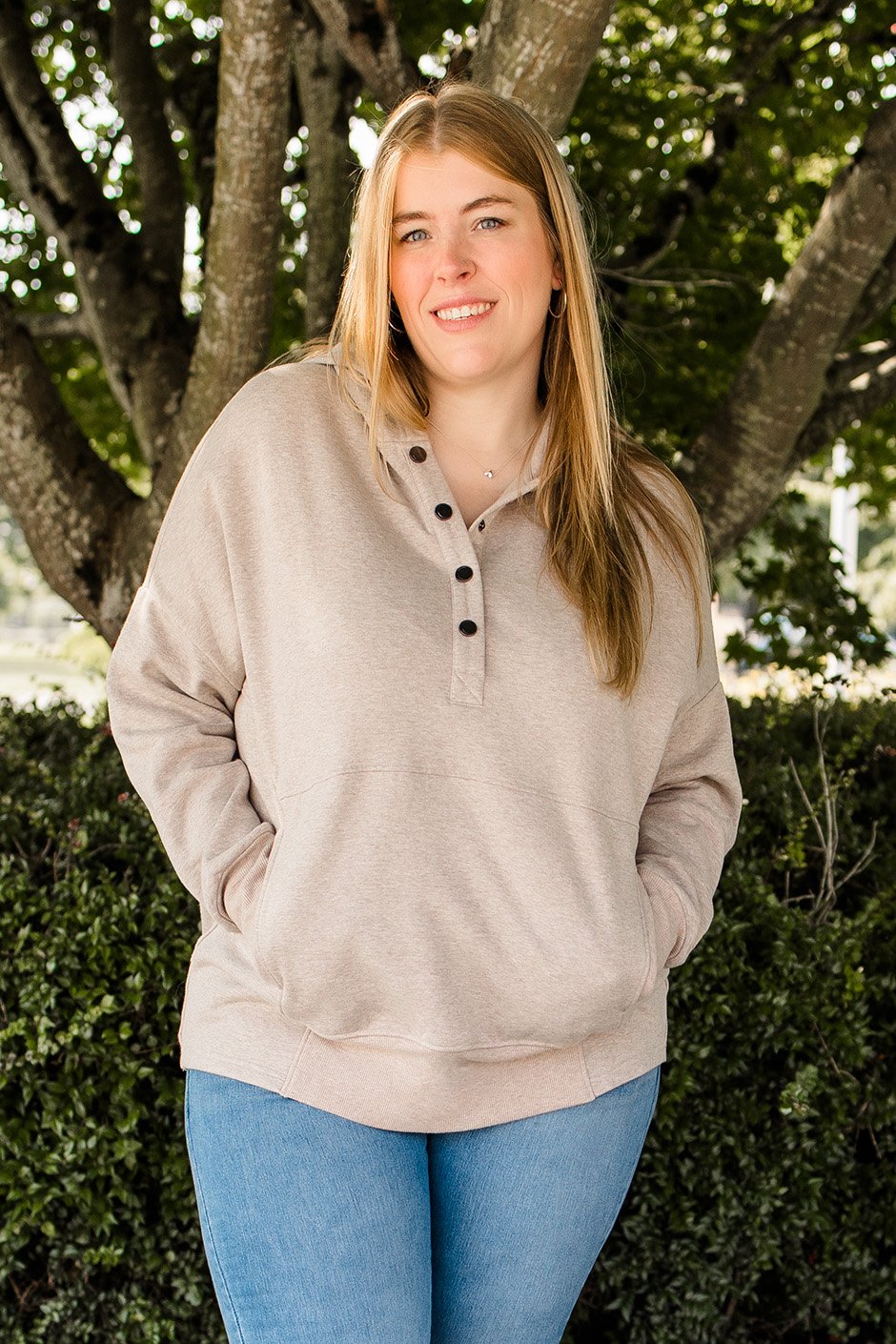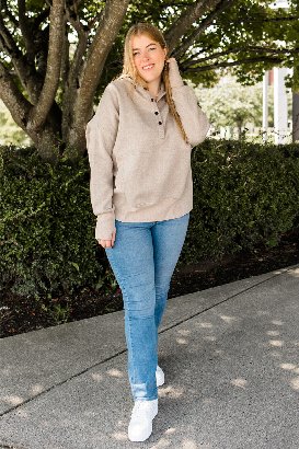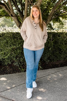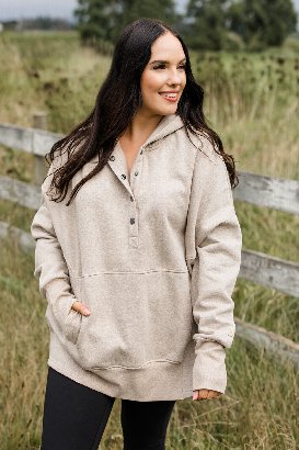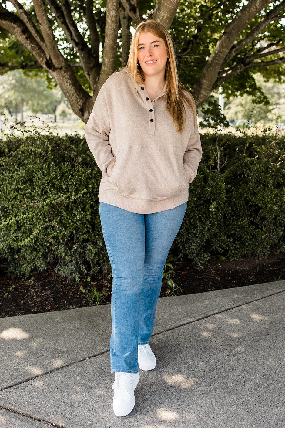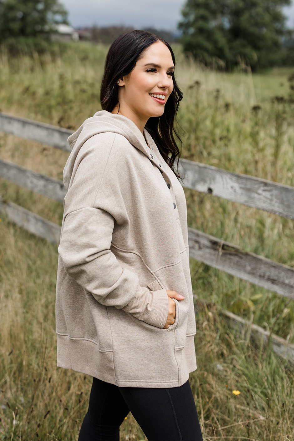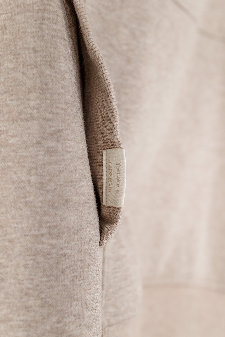 I am so excited about this new brand! This hoodie has a super soft and fleecy interior, kangaroo pocket, and functional snaps. I really love the oversized and cozy fit! My favourite detail is the little hidden message on the tag of the pocket though! So cute! I am wearing an XL and I love the oversized fit. I could wear a L for a different look though!