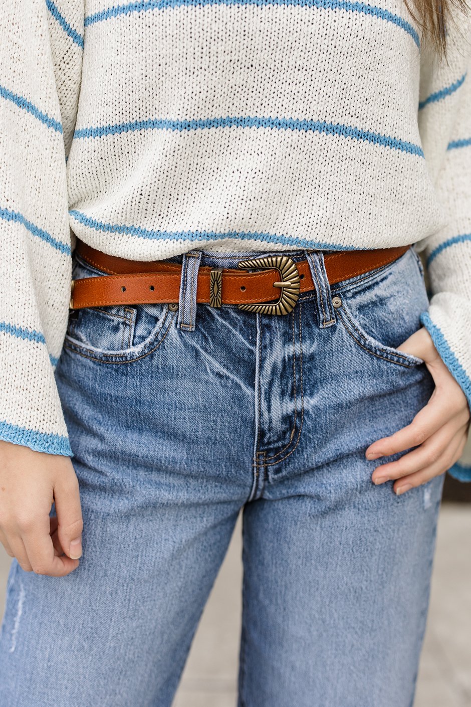 This belt totally brings the look together! It has sort of vintage looking buckle and classic cognac colour that will compliment a variety of outfits. It’s versatile enough to wear with jeans for a casual look or to cinch a flowy dress for a more polished ensemble. An absolute wardrobe must have! I'm wearing the size XL for reference.