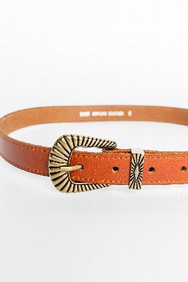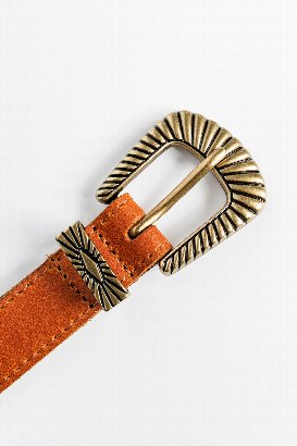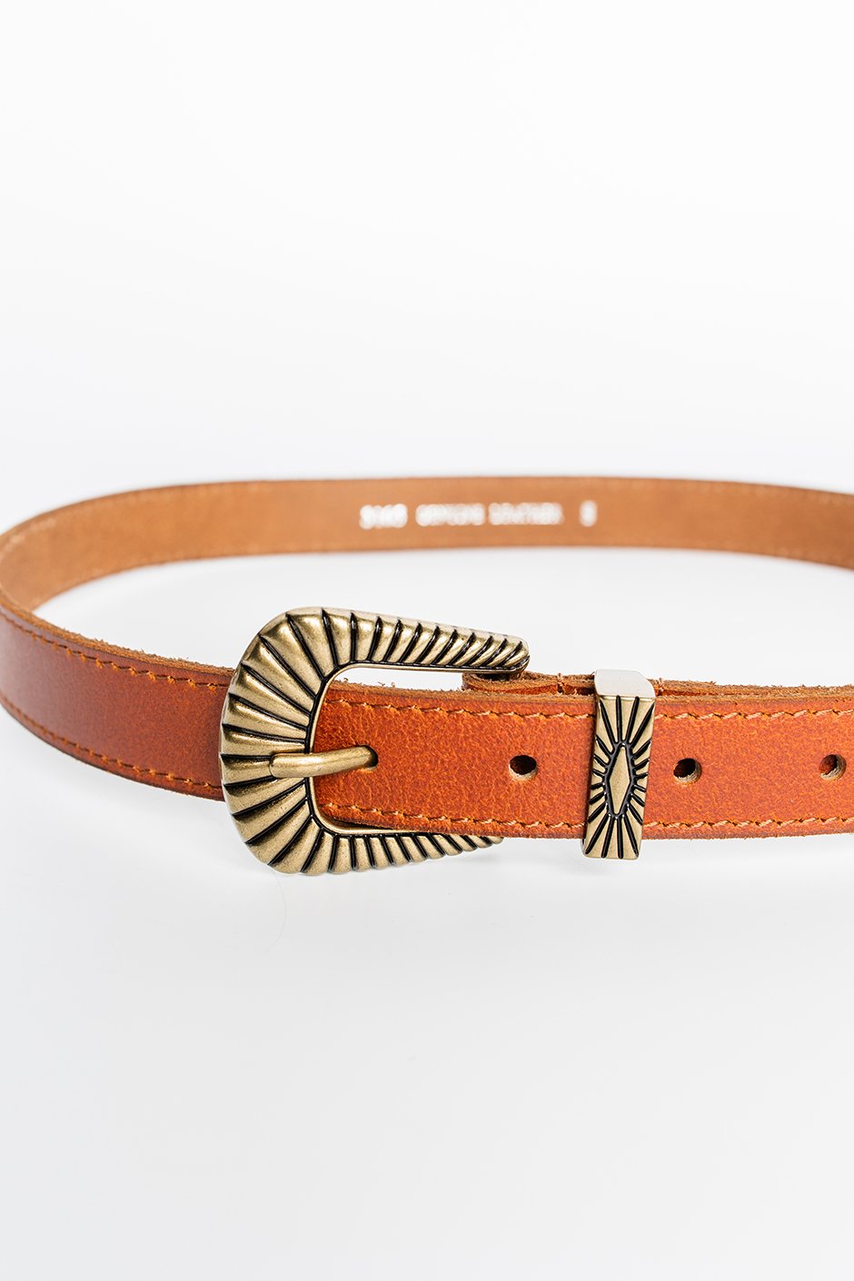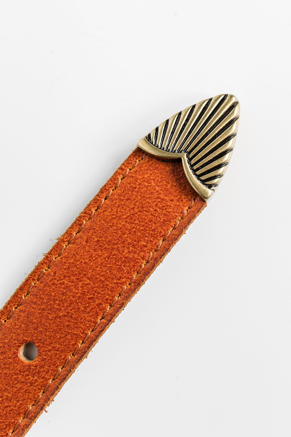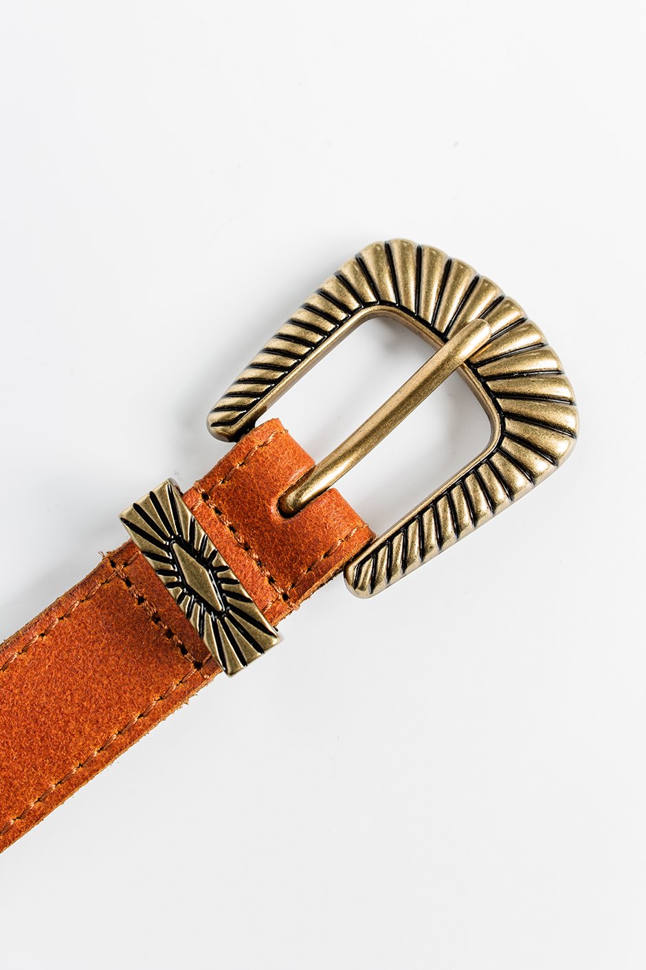 Crafted from leather and adorned with exquisite brass buckles, the belt in this three-piece ensemble is a testament to artisanal craftsmanship. Elevate your ensemble with a touch of bohemian flair.