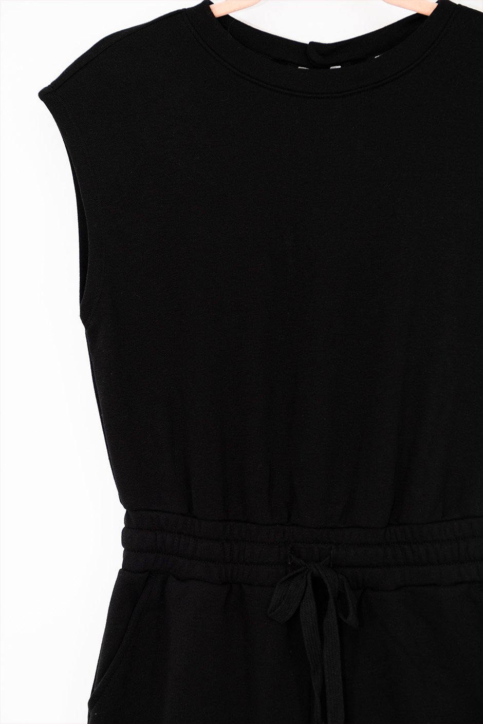 This romper is so comfy, it legit feels like sweatpants! It's super comfy, relaxed in fit and I love the elastic at the waist. It gives a more defined silhouette but it's up high enough that it's quite flattering. There are pockets and a nice cap sleeve. I'm wearing the size small and the fit is great. TTS without being too fitted.