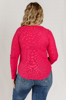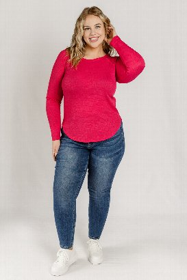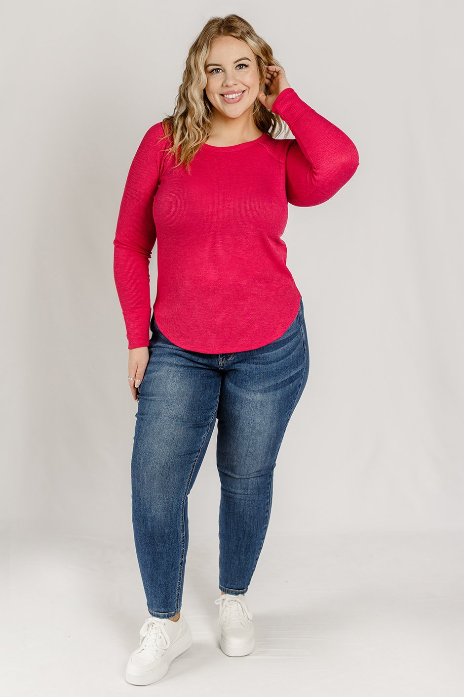 I love love love this top!!! It's very similar to the Laurel Waffle Top but shorter in length and a bit more form-fitting. The material is the same and it still features a rounded hemline. The material is super stretchy and nice and lightweight and perfect for transitioning into spring with as it's still a long sleeve!