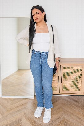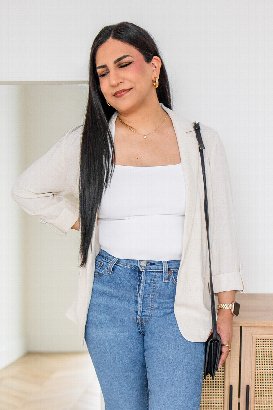 I am actually shook that I slept on this piece. It’s sooo lightweight, comfy, and drapes beautifully. I wore my usual 38 and the fit was great. The cuffed sleeves are such a nice touch and let you show off your favorite bracelets. Blazers are honestly timeless and the perfect thing to throw on when you’re unsure what to wear for an event. I styled it over a simple tank and jeans, and it instantly elevated the whole outfit. I can also see it with a dress, skirt, or even linen pants for a full monochrome look.