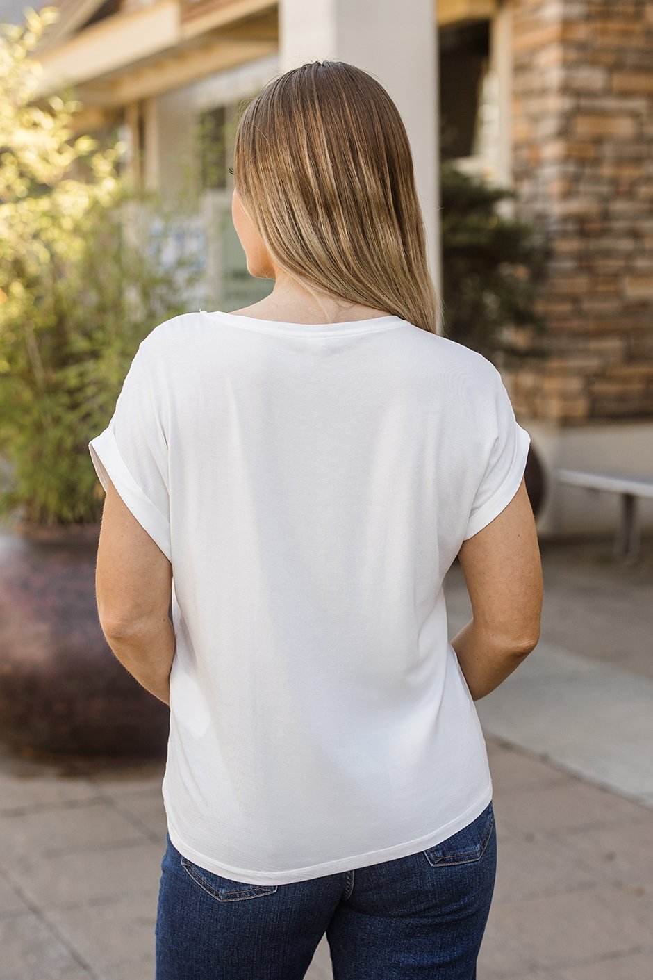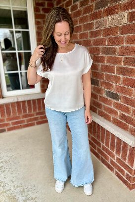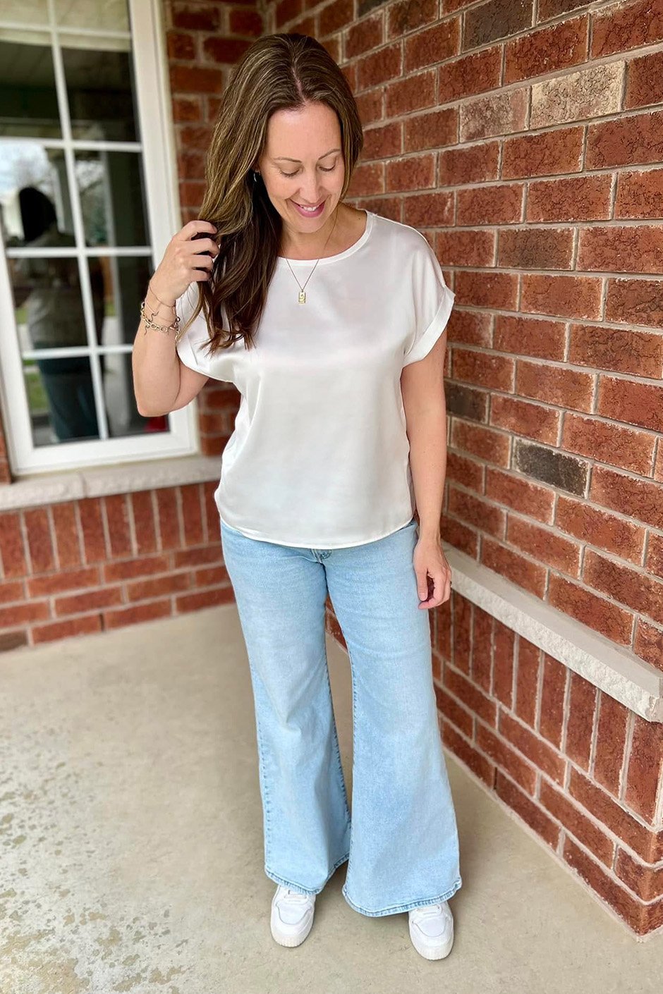 I just love this type of top! It’s giving business in the front party in the back vibes. The satin silky front has a sophisticated look while the back offers all the comfort. Super cute capped sleeves with very soft lightweight fabric. I adore the round neckline as well. Wearing the size XL, and it’s the size I will purchase.