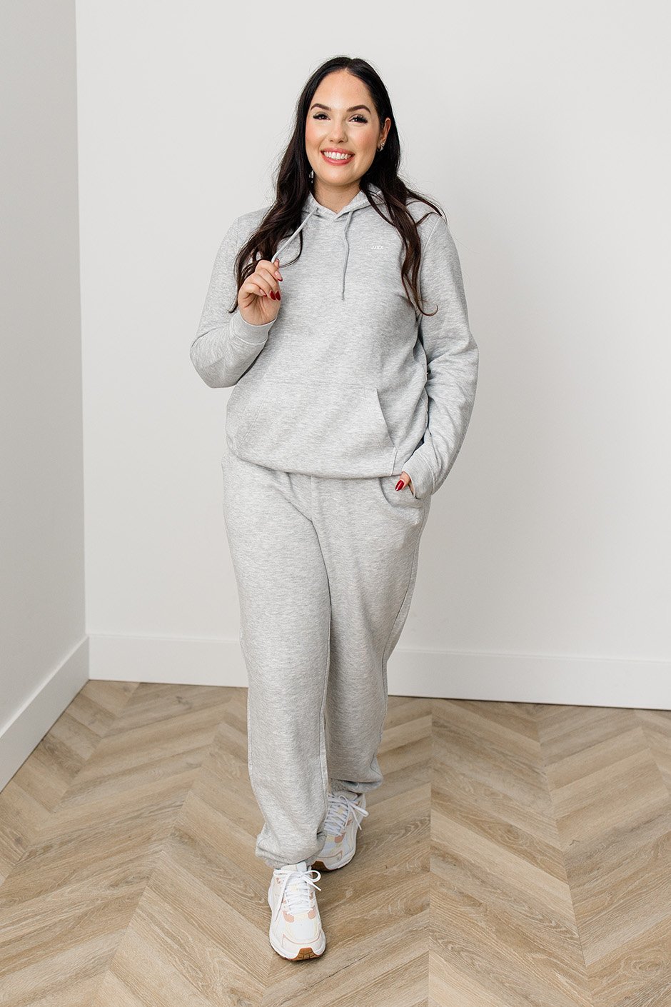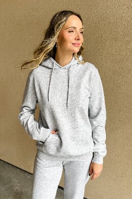 I’m a sucker for a matching sweatsuit, and this hoodie definitely sealed the deal for me! I’m wearing a size small and the fit is perfect—not too oversized, but not tight or restrictive either. Some hoodies can feel a little claustrophobic, but this one doesn’t at all. It has all the functional details I love too: kangaroo pockets, adjustable drawstrings, a cozy hood, and the inside lining is insanely soft.